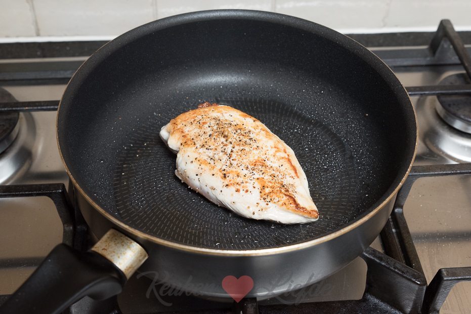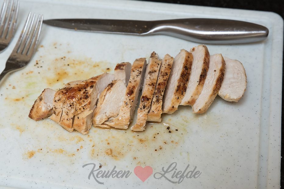Bestrooi de kip met zout en peper en bak aan beide kanten in de koekenpan, totdat hij gaar is. Leg op een snijplank en laat iets afkoelen.