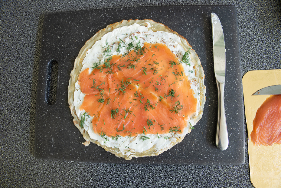 Bestrijk de pannenkoeken aan één kant royaal met roomkaas en beleg met wat plakjes gerookte zalm en versgeknipte dille. Rol de pannenkoek zo strak mogelijk op en wikkel in vershoudfolie. Draai strak dicht zoals een toffee en leg ze minimaal 30 minuten in de koelkast om op te stijven, zo kun je ze straks makkelijker snijden.