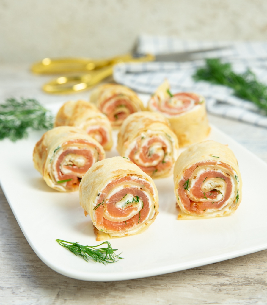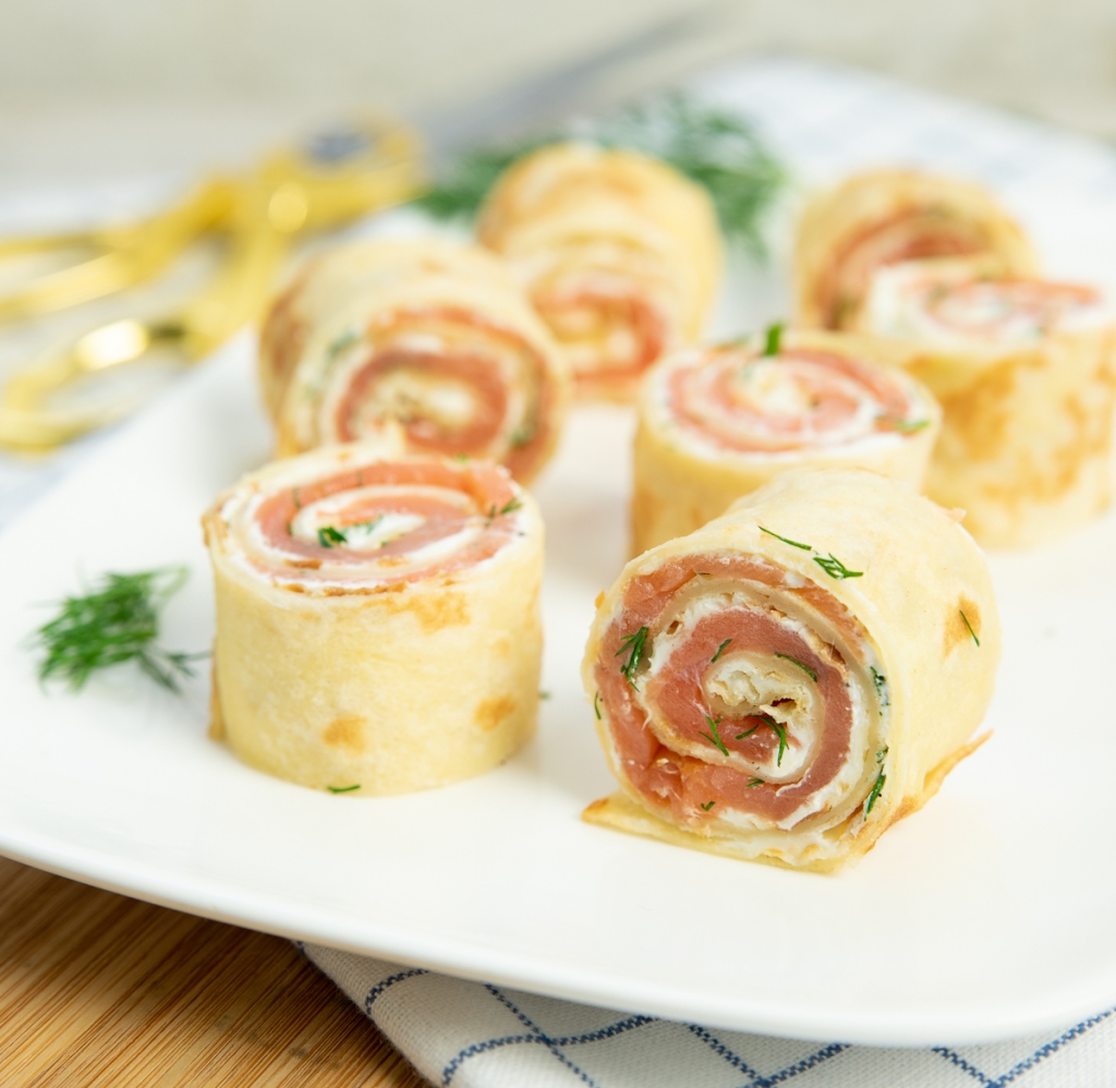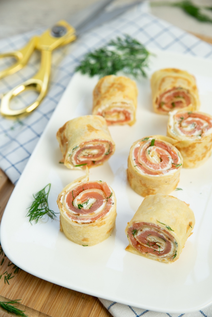 Deze pannenkoekhapjes zijn gevuld met zalm, roomkaas en dille. Een gouden combi waar iedereen dol op is!