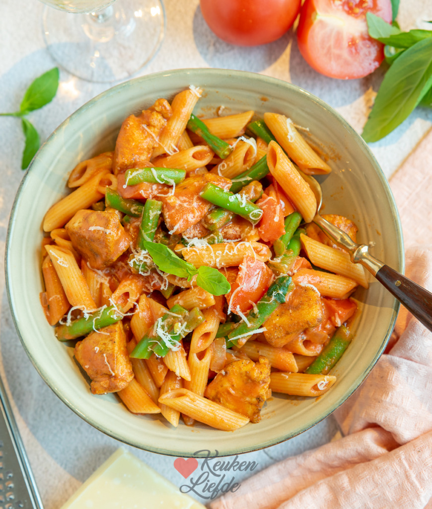 Pasta met kip en sperziebonen in tomatenroomsaus. Een heerlijk gerecht dat gemakkelijk te bereiden is snel op tafel staat.