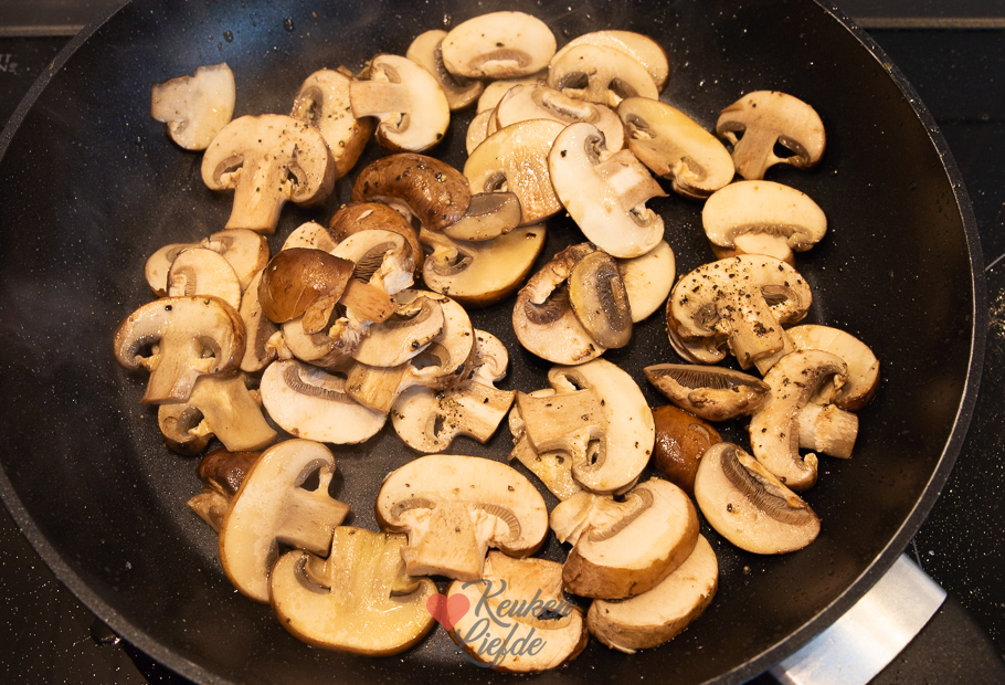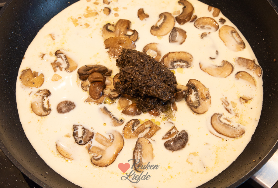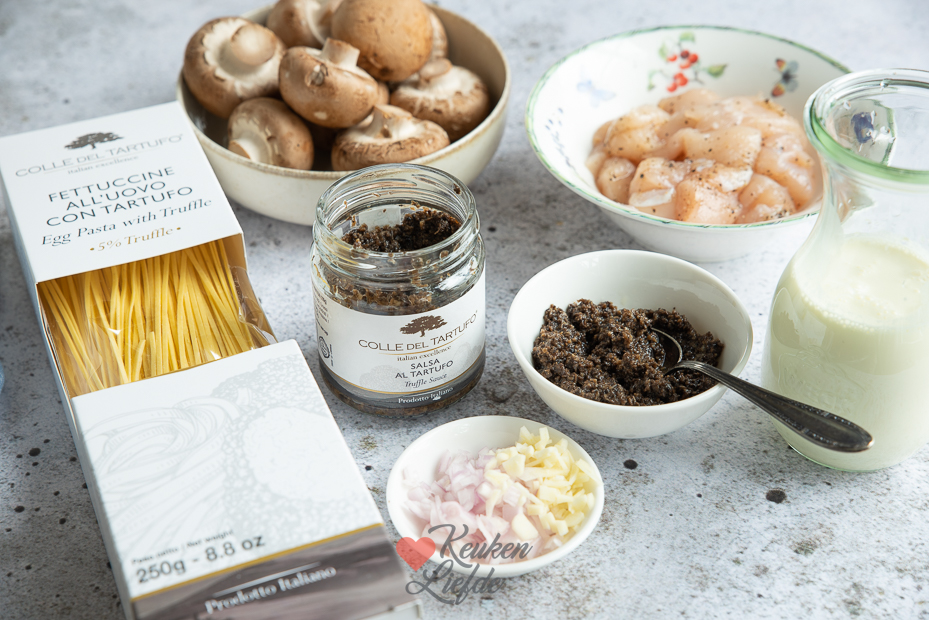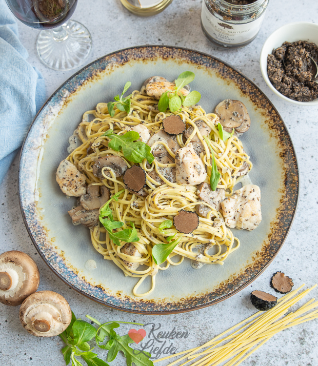 Pasta met truffel, champignons en kip. Een heerlijk pastagerecht met romige truffelsaus, gebakken champignons en kip. Makkelijk om te maken en klaar in 15 minuten!