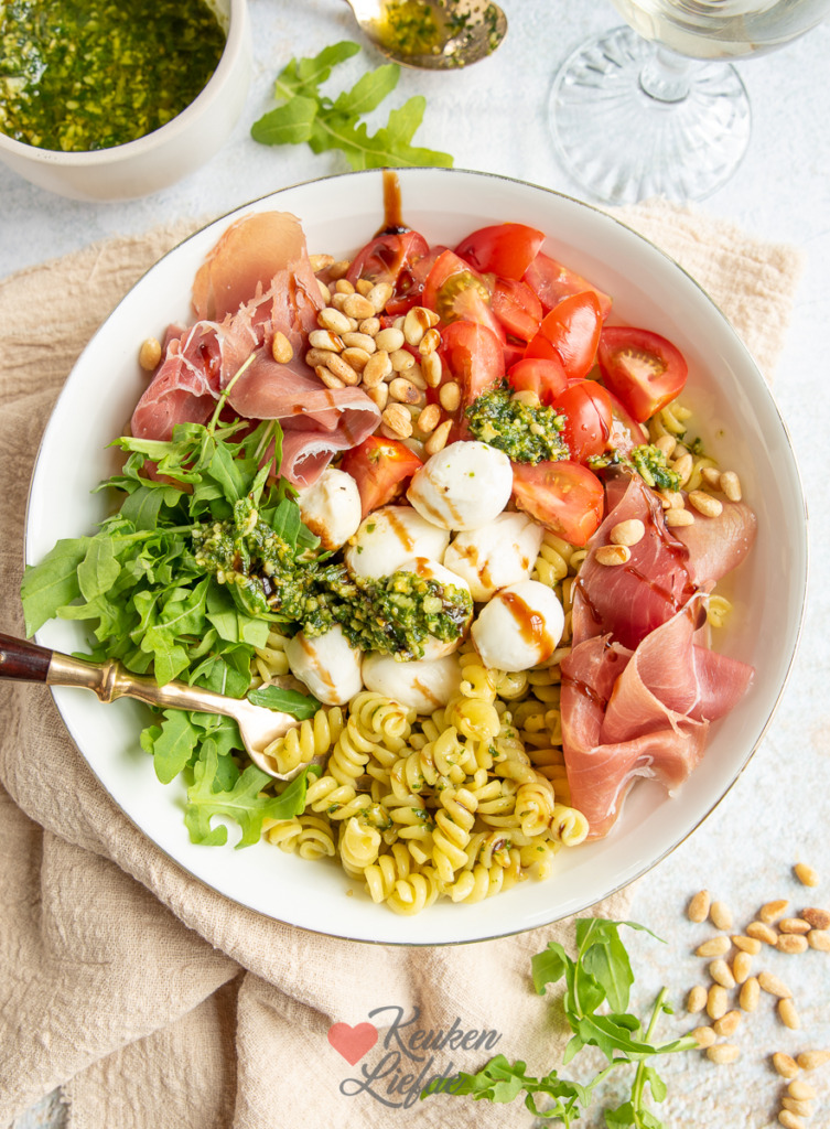 Deze pasta pesto bowl is goed gevuld met fusilli pasta, tomaatjes, parmaham en mozzarella. De verse pesto maakt dit gerecht helemaal af. Een makkelijk en snel gerecht dat in 15 minuten op tafel staat.