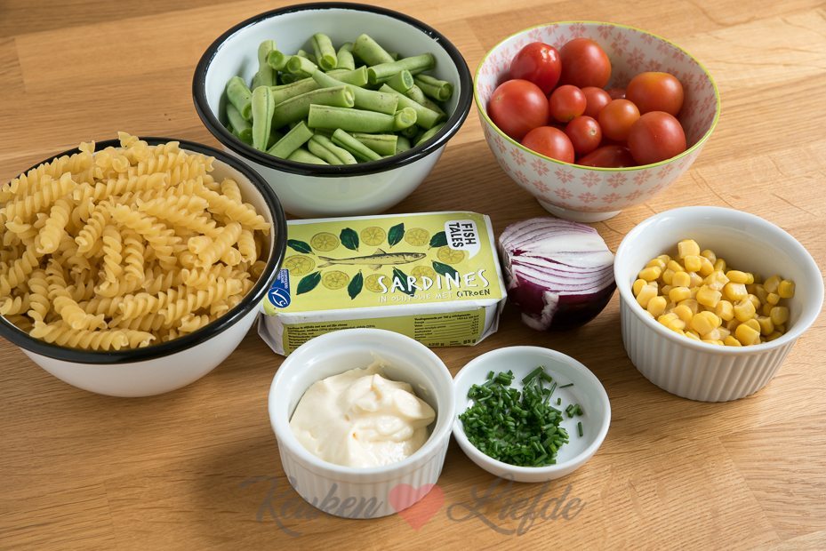 Vroeger mocht je me echt wakker maken voor een goed gevulde pastasalade. Vandaag de dag hecht ik wat meer waarde aan een goede nachtrust, maar ik vind pastasalade nog steeds superlekker. Mijn man kan echt de allerlekkerste pastasalade maken (zijn geheim is dat hij er alles ingooit wat hij maar kan vinden in de koelkast), maar vandaag ben ik zelf aan de slag gegaan. Ik heb de vulling eenvoudig gehouden met sperziebonen, rode ui, cherrytomaten en sardines uit blik. Sardines uit blik geven zoveel smaak dat meer ingrediënten overbodig zijn. Vergeet ook vooral niet om de olie uit het blikje sardines aan de pastasalade toe te voegen. Dat is een smaakbommetje!