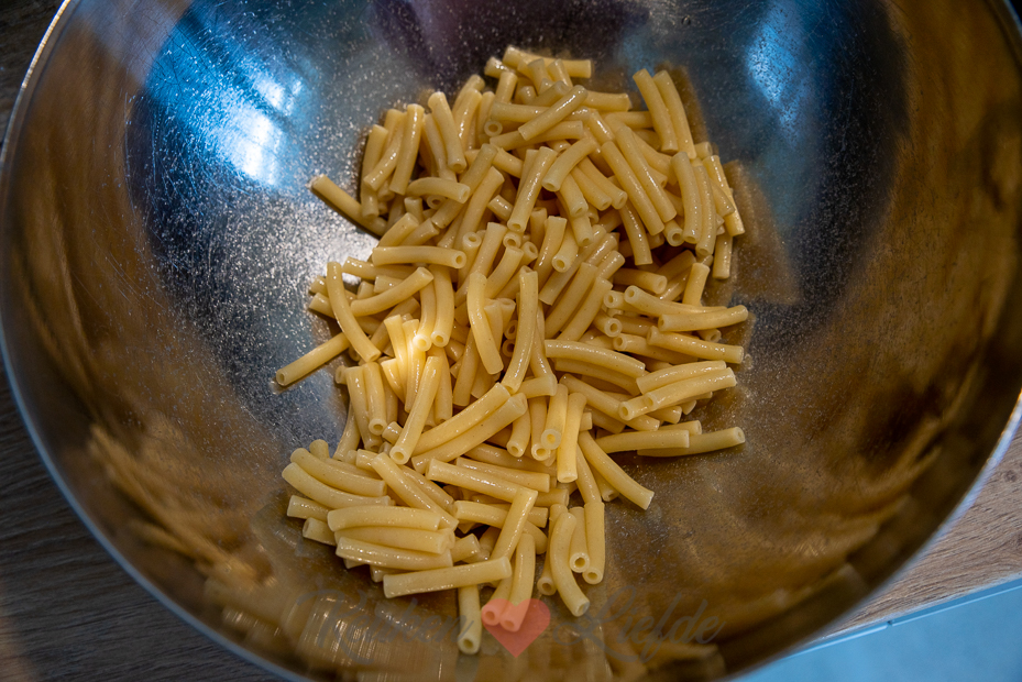 Kook de pasta beetgaar in een ruime pan met licht gezouten, kokend water. Spoel de pasta af met koud water en laat uitlekken in een vergiet. Hussel om met een scheutje olijfolie zodat hij niet gaat plakken.