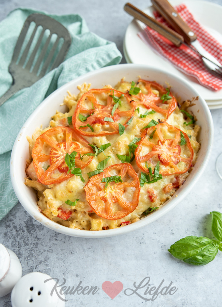 Roer de pasta, groenten en rauwe zalmblokjes door de saus en schep alles in de ovenschaal. Bestrooi met de kaas en beleg met plakken tomaat.