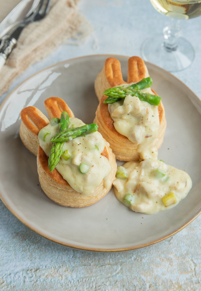 Een heerlijk pasteitje met zelfgemaakte kipragout en groene aspergetips. Omdat het bijna Pasen is serveer ik ze in paashaas-pasteibakjes. Die vind je gewoon in de supermarkt. Lekker om te serveren als voorgerecht, op de brunchtafel, of als hoofdgerecht. Met een pasteitje kun je alle kanten op.