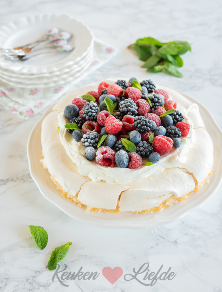 Pavlova is het favoriete dessert van dochterlief en ik snap wel waarom. Deze pavlova is gemaakt van knapperig en bros gebakken eiwitschuim (dat nog zacht is vanbinnen) en bedekt met mascarponeroom en verse bosvruchten! Het perfecte dessert om indruk te maken op gasten of familie en helemaal niet moeilijk om te maken. Geloof me, veel beter dan dit wordt het niet!