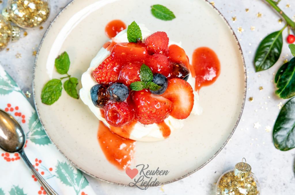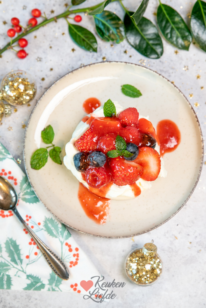 Een makkelijk pavlova dessert waar je hoge punten mee scoort tijdens het kerstdiner. Knapperig meringueschuim bedekt met mascarponeroom en vers rood fruit. Hier maak je iedereen blij mee! Dit dessert is onderdeel van een 4-gangen klassiek kerstmenu, maar kan natuurlijk het hele jaar door geserveerd worden. Net zoals de andere gerechten uit het kerstmenu kun je deze pavlova grotendeels al voorbereiden. Vlak voor serveren hoef je alleen maar de ingrediënten mooi op het bord te dresseren. Zie onderstaande tip!