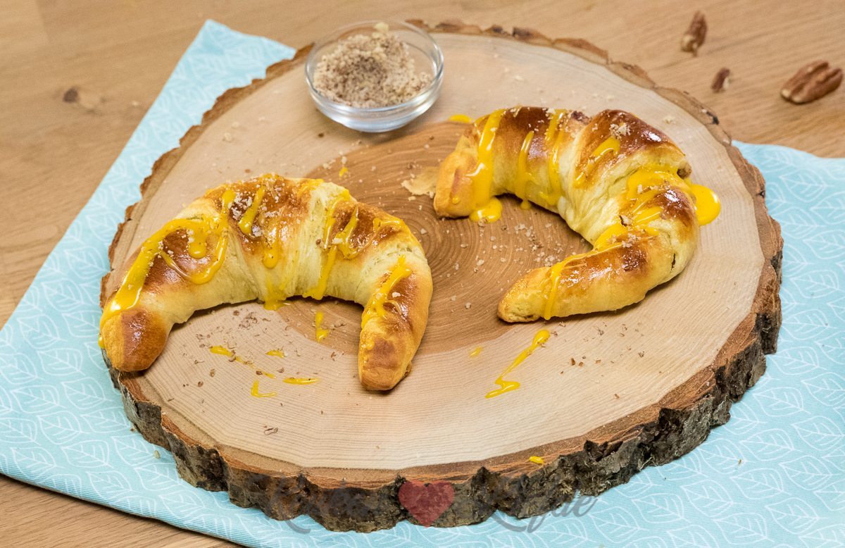 Meng de poedersuiker met een klein scheutje water en roer tot een dik, vloeibaar glazuur. Kleur het glazuur eventueel geel met een paar druppels gele levensmiddelenkleurstof. Drizzle het glazuur over de croissants en bestrooi met de achtergehouden pecannoten.