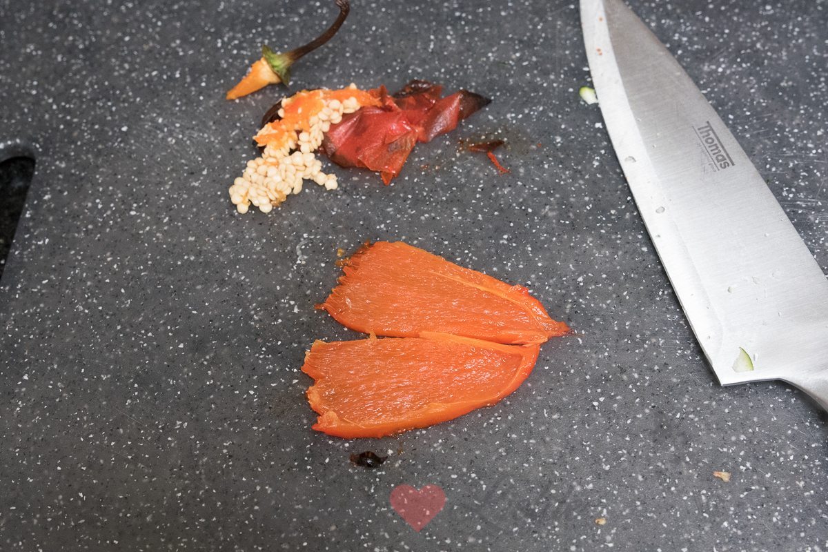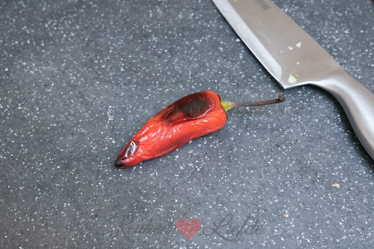 Verwarm de oven voor op 220 graden. Leg de rode peper op een met bakpapier bekleed bakblik en rooster circa 20 minuten in de oven, of totdat het vel zwartgeblakerd is. Haal uit de oven en laat iets afkoelen. Trek het vel van de peper en verwijder de zaadlijsten.