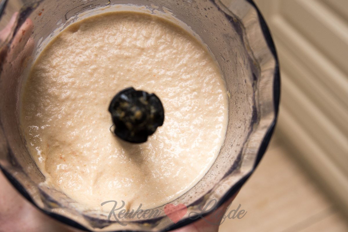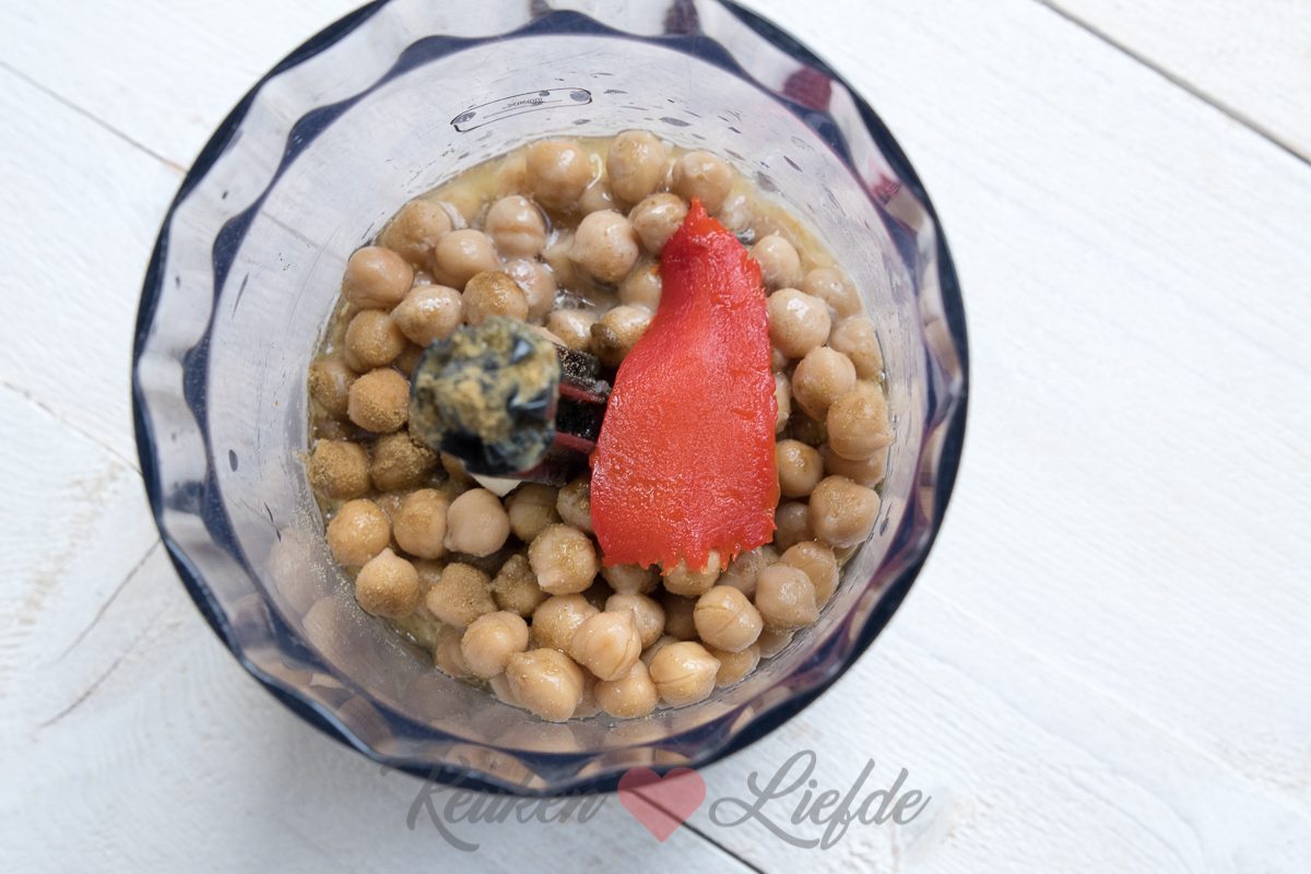Laat de kikkerewten uitlekken in een vergiet en doe ze samen met de peper, knoflook, tahin, citroensap, komijnpoeder, een flinke snuf zout, een flinke scheut olijfolie en een flinke scheut koud water in de keukenmachine. Maal fijn tot een gladde, smeuïge puree. Als je puree nog te grof is, kun je nog een extra scheut koud water toevoegen.