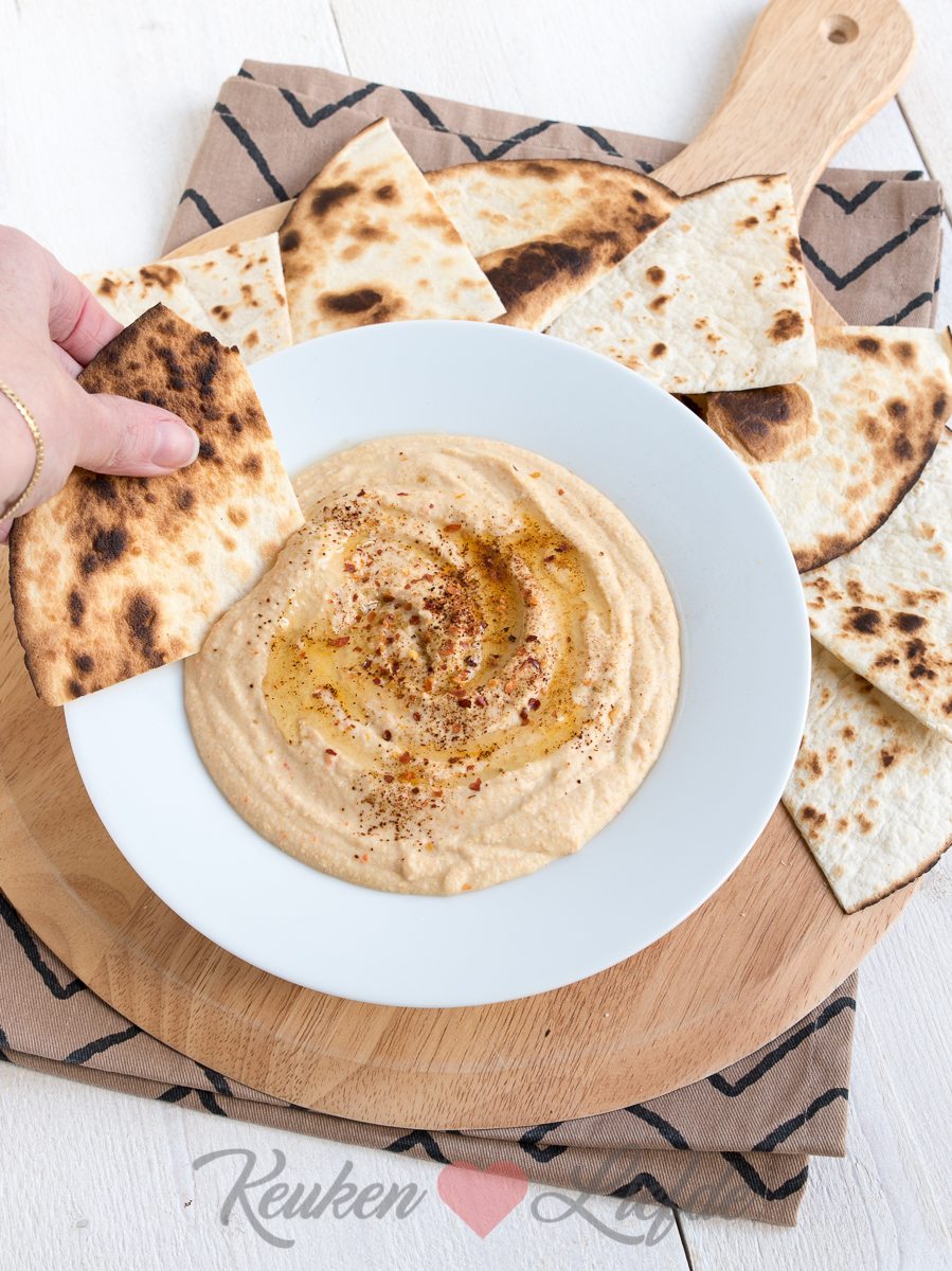 Schep de hummus in een mooie kom of schaal. Druppel er nog wat olijfolie overheen en garneer eventueel met wat achtergehouden kikkererwten en cayennepeper.