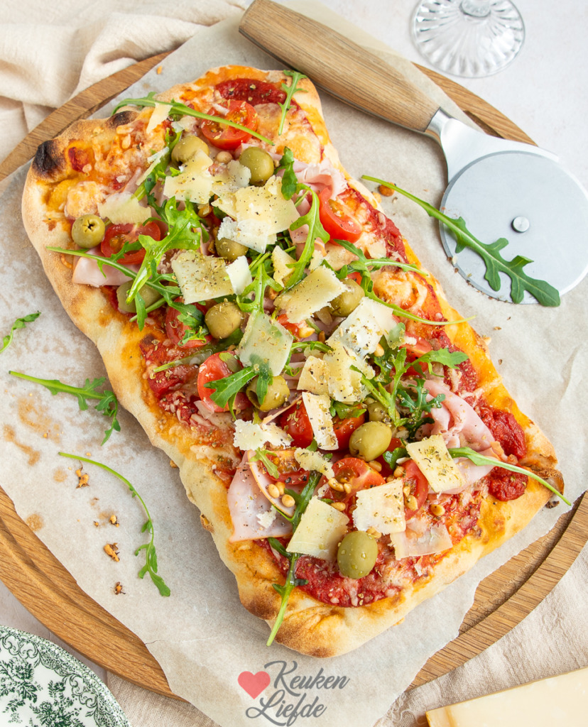 Voor dit recept kocht ik een voorgebakken afbak pinsa in de supermarkt (je vindt hem bij een goed gesorteerde Jumbo of AH). Zelf heb ik namelijk nog geen pinsadeeg gemaakt, maar dat ga ik zeker binnenkort doen zodat ik dat recept ook met je kan delen.