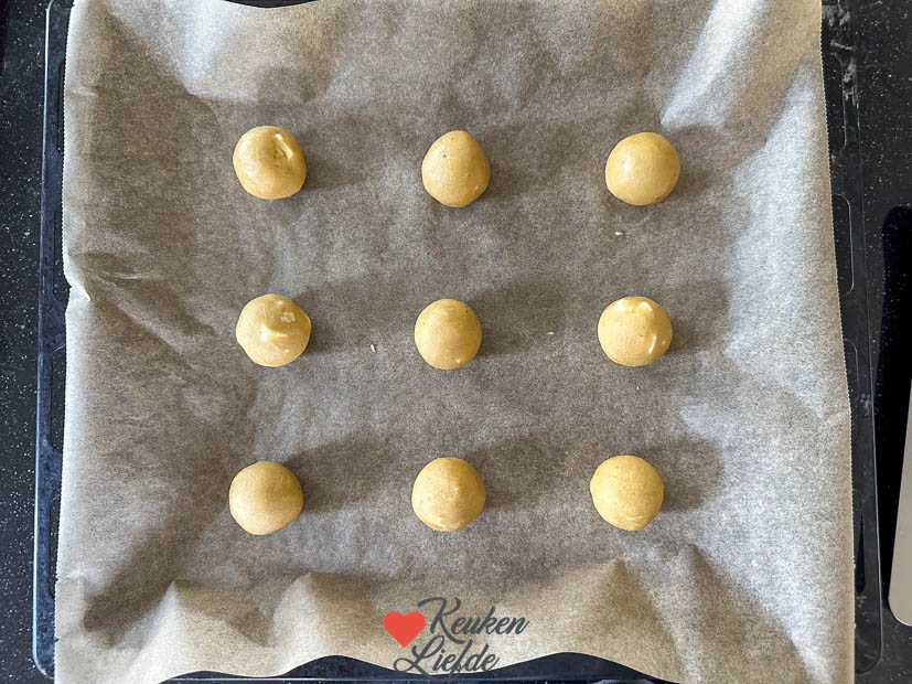 Snijd stukjes deeg af van 35 gram en draai er balletjes van. Leg ze op het bakblik met wat ruimte ertussen want ze worden iets groter. Je zult in totaal 3 bakblikken nodig hebben voor de koekjes en dus meerdere keren moeten bakken. Bewaar het deeg dat je niet gebruikt zolang in de koelkast.
