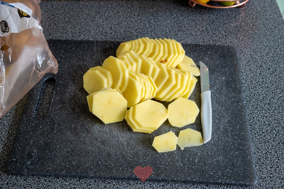 Verdeel 1/3 van de aardappelschijfjes over de bodem van de ovenschaal en verdeel daar 1/3 van de saus over. Herhaal deze laagjes tot alle ingrediënten op zijn. Eindig met de pittige bechamelsaus en de overige kaas.
