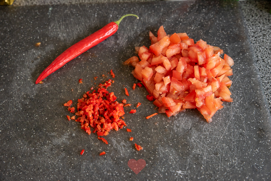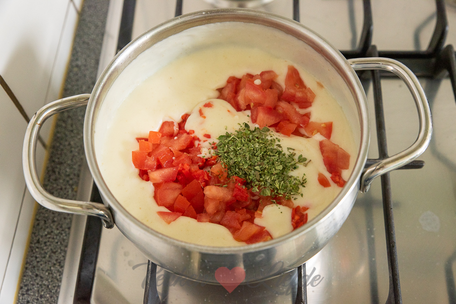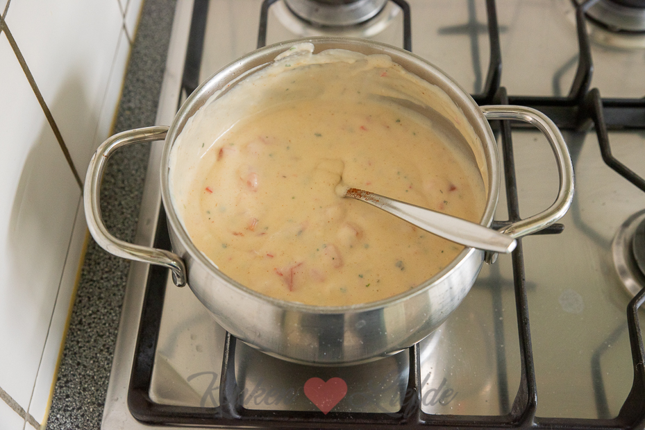Smelt de roomboter in een ruime pan. Voeg de bloem toe en bak al roerend op laag vuur circa 5 minuten, om de bloem te laten garen. De roux (=boter en bloem) niet laten kleuren. Voeg de bouillon en room en breng al roerend met een garde aan de kook. Laat 5 minuten zachtjes pruttelen tot je een mooi gebonden, gladde saus hebt. Voeg de tomaat, rode peper (proef eerst hoe heet de peper is en bepaal dan hoeveel je toe wilt voegen), paprikapoeder, oregano en de helft van de kaas toe en warm nog enkele minuten door tot de kaas gesmolten is.