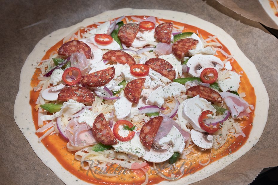 Verwarm de oven voor op de hoogste stand. Ik gebruik altijd de pizzastand op onze oven (die genereert extra onderwarmte) en zet die op de maximale stand, 220 graden.