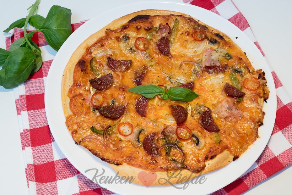 Bestrijk de pizzabodem met tomatensaus — houd circa 1,5 cm van de rand vrij. Beleg de pizza eerst met de kaas en dan de overige ingrediënten.