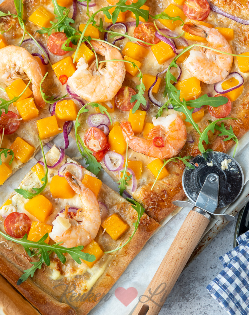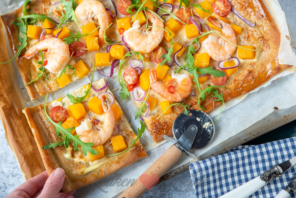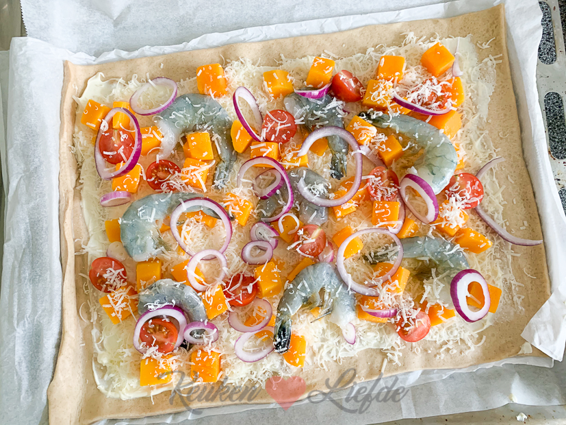 Een heerlijke pizza van de bakplaat met pompoen en grote, gemarineerde knoflookgarnalen. Door ongepelde garnalen te gebruiken, blijven de garnalen lekker mals en sappig, maar toch zou ik de volgende keer gepelde garnalen op de pizza leggen. Grote, ongepelde garnalen zijn lekker om te bakken op hoog vuur, maar bovenop de pizza vond ik ze minder geschikt. Ook koelt je pizza af als jij eerst nog je garnalen moeten pellen. Ga je deze pizza maken dan zou ik dus rauwe, gepelde garnalen gebruiken (darmkanaal verwijderd) en die marineren, zo kan de marinade goed in de garnalen trekken. Hieronder geef ik dus ook de bereiding voor rauwe, gepelde garnalen in plaats van de ongepelde garnalen die je op de foto ziet. Serveer als hoofdgerecht met een salade erbij.