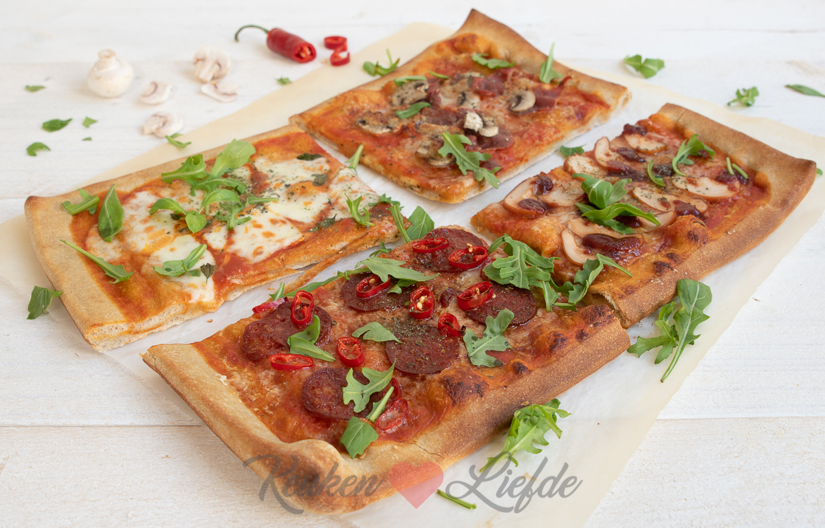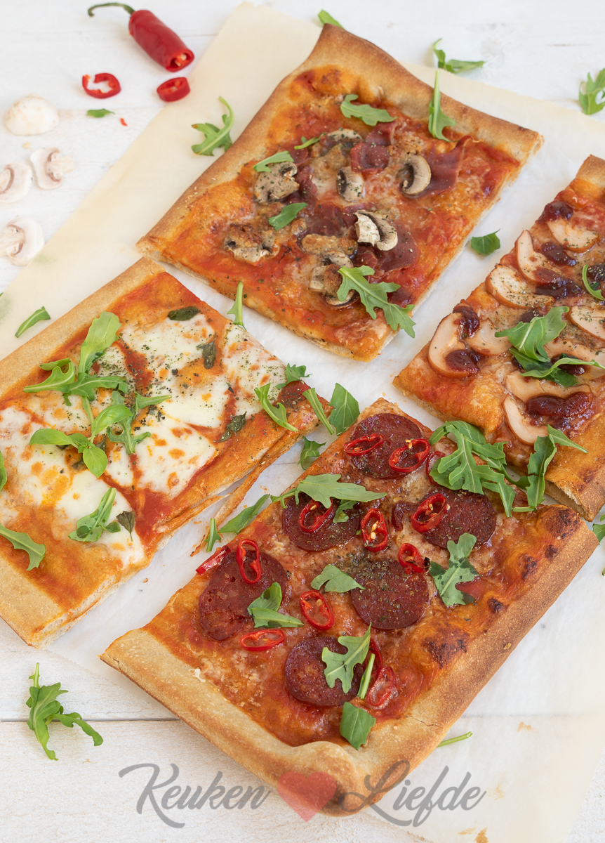 Dit keer maak ik een grote plaatpizza om te delen die ik beleg in vier smaken: margherita, champignon en prosciutto, spicy pepperoni en barbecue chicken. Makkelijk om te maken en voor ieder wat wils!