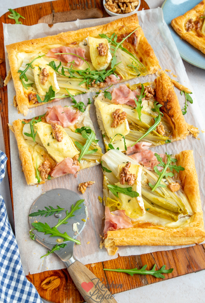 Een heerlijke plaattaart met brie, witlof, walnoot en honing. Voor een hartig accent voeg ik plakjes ham toe. De zoutige ham en lichtbittere witlof zijn een heerlijke match en de brie maakt deze plaattaart lekker romig. De bodem van deze plaattaart maak je makkelijk en snel met een rol koelvers bladerdeeg.