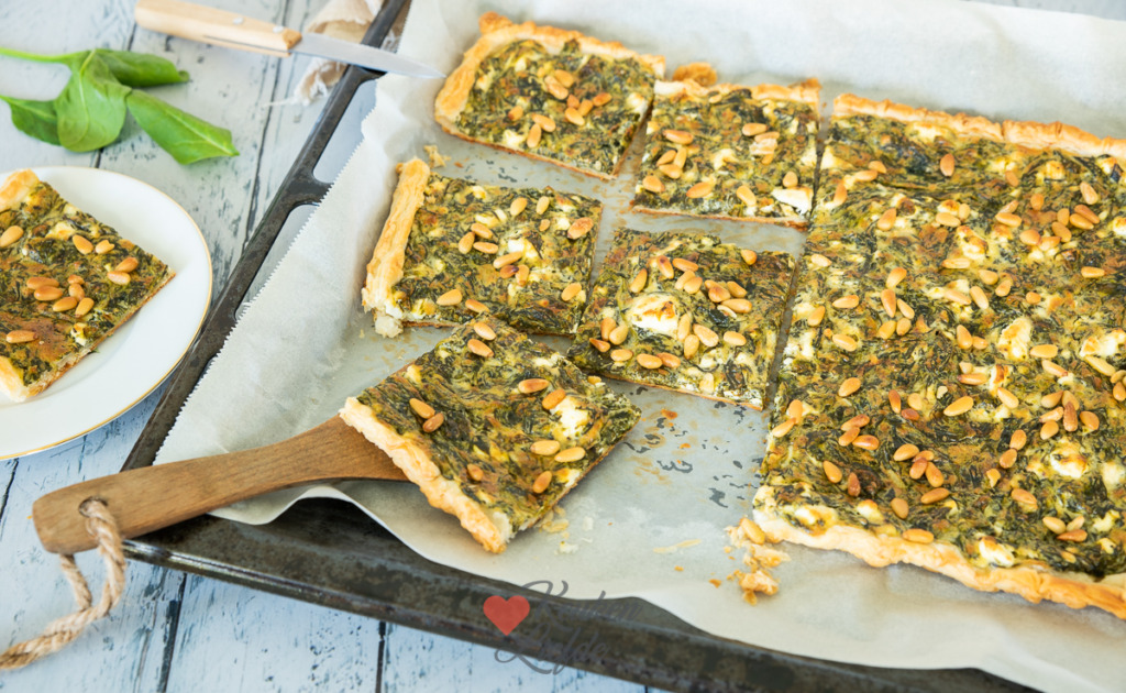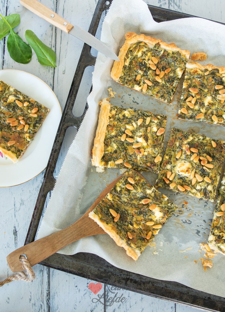 Een lekkere plaattaart met spinazie, feta en pijnboompitten van het bakblik. Deze plaattaart is heel makkelijk om te maken met een rol bladerdeeg, maar je kunt ook plakjes bladerdeeg uit de vriezer gebruiken. De combinatie van spinazie, feta en pijnboompitjes is heerlijk! Serveer deze plaattaart als hoofdgerecht voor 2 personen met een salade erbij, of snijd hem in vierkantjes en serveer als bijgerecht of hapje.