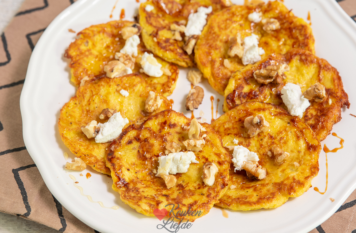Ik ben dol op rösti maar omdat het herfst is besloot ik hem te maken van pompoen. Deze pompoenrösti is wat zoeter van smaak dan aardappelrösti en combineert daardoor heerlijk met geitenkaas, honing en walnoot. Op de foto zie je trouwens ook dat ik er ook nog wat bruine schenkstroop overheen druppelde. Dat doe ik ook altijd over de reibekuchen en vind ik een heerlijke combi. Probeer maar eens!