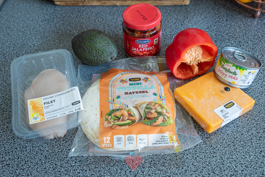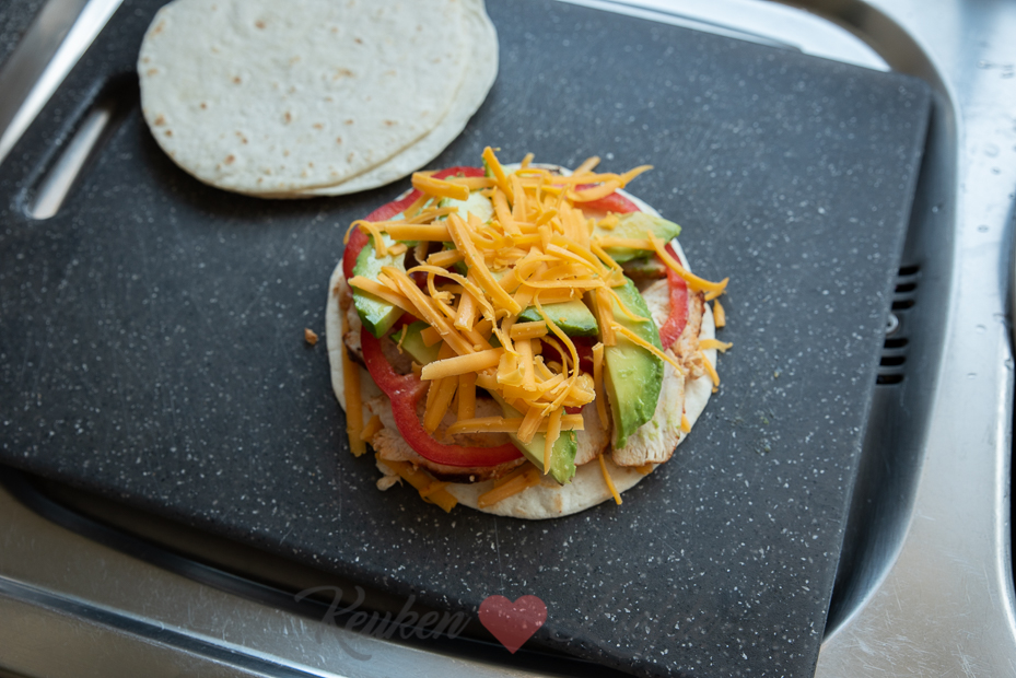 Beleg twee tortillawraps met de helft van de cheddar, gevolgd door de kip, avocado, paprika, mais, jalapeño en bestrooi met de overige cheddar. Dek af met de overige twee wraps.