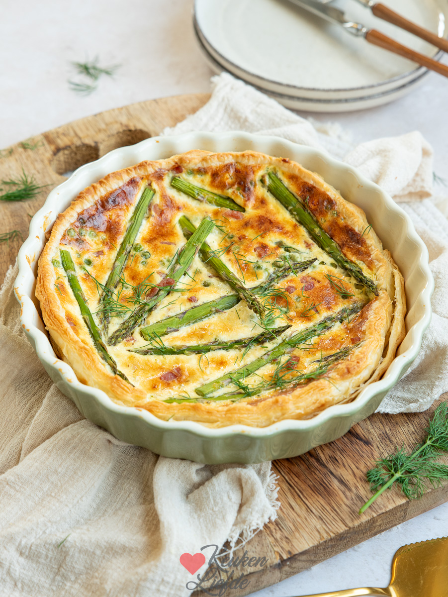 Een heerlijke quiche met asperges, doperwten en spekjes en een knapperige bodem van bladerdeeg. Je hoeft alleen de spekjes van tevoren uit te bakken. De groene aspergetips en doperwten garen in de quiche in de oven. Een makkelijk recept met verrukkelijk resultaat!