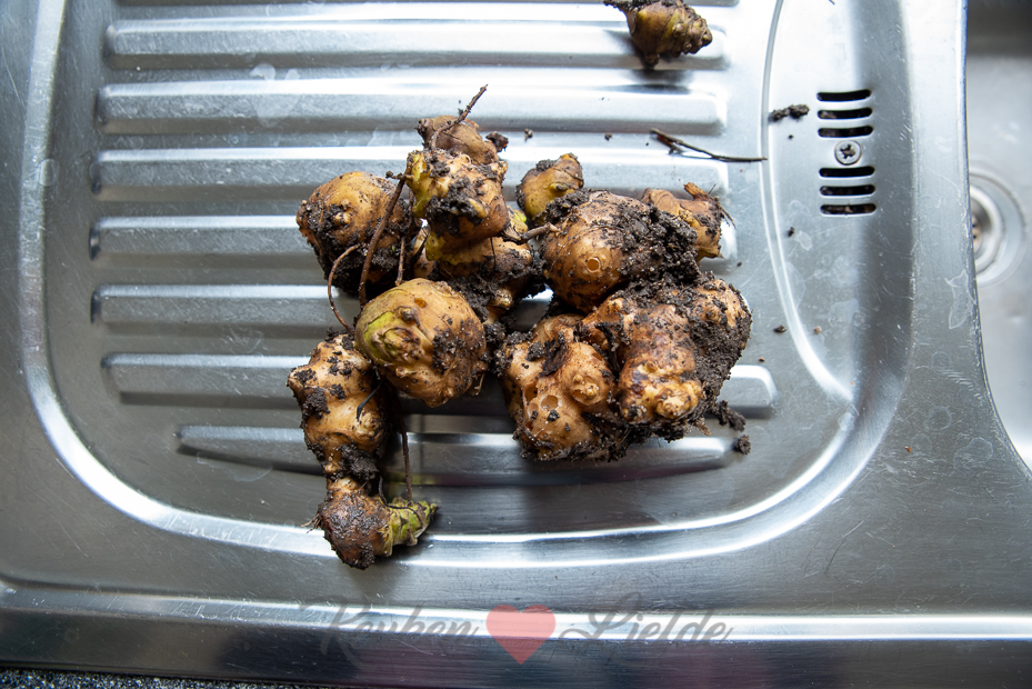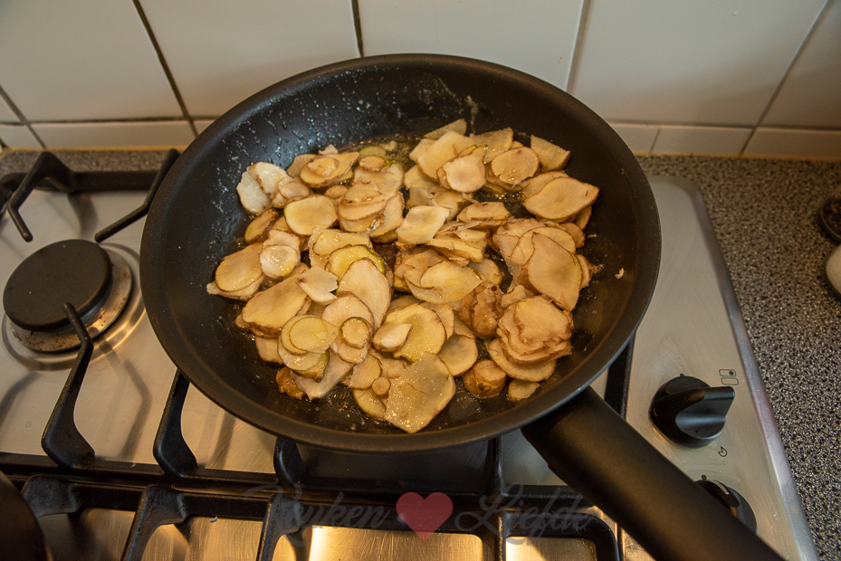 Verhit – ondertussen als de risotto pruttelt – de overige roomboter met een klein scheutje olijfolie in een koekenpan en bak de plakjes aardpeer circa 10 minuten op middelhoog vuur, tot ze zacht en goudbruin zijn. Breng op smaak met peper en zout. Voeg de hazelnoten toe en bak nog 2 minuten mee.