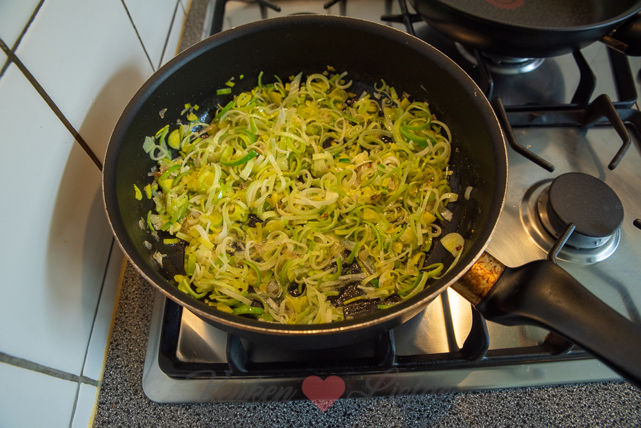 Verhit 4 el roomboter en een klein scheutje olijfolie in de hapjespan en fruit de sjalot 1 minuut op middelhoog vuur tot hij zacht is. Voeg de prei toe en bak nog 5 minuten verder.