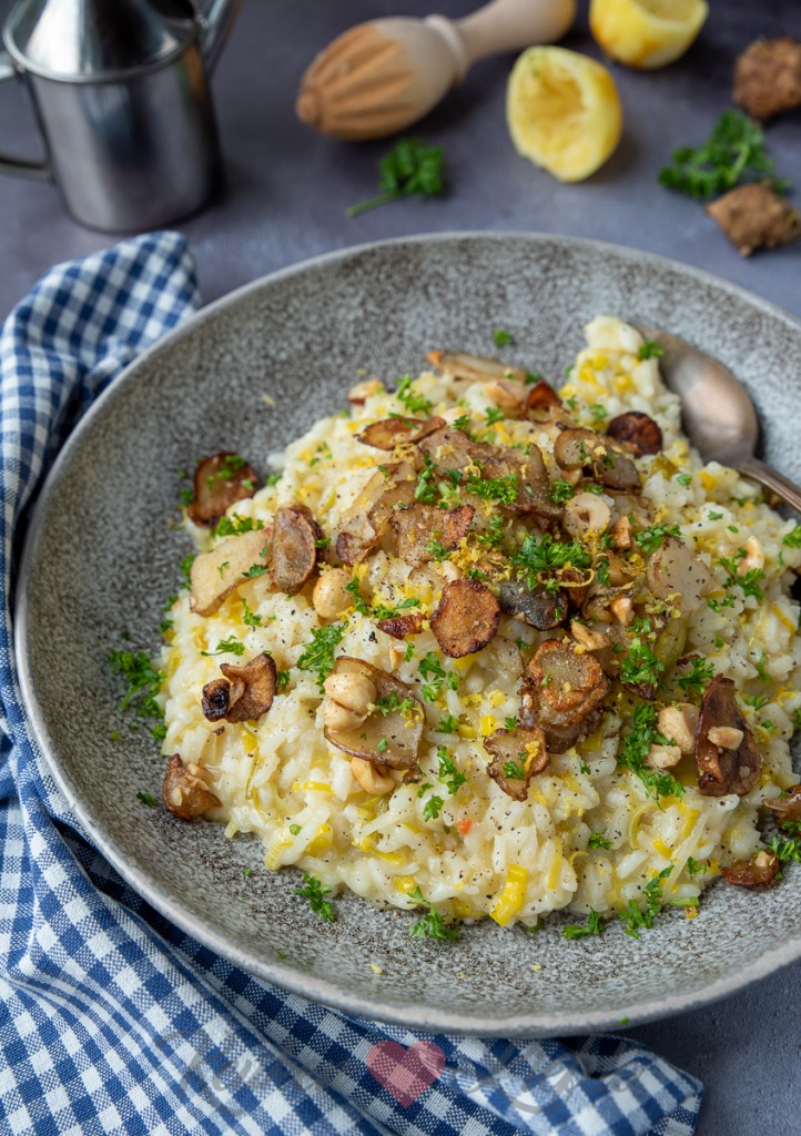 Roer de Gruyère en 1 à 2 el citroensap (naar eigen smaak) door de risotto. Breng op smaak met peper.