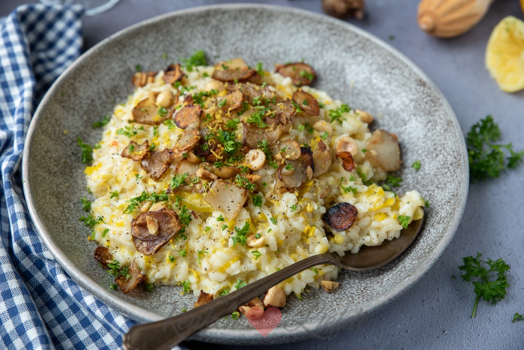 Verdeel de risotto over de borden en garneer met de aardpeer en hazelnoten. Bestrooi naar smaak met peterselie, citroenrasp en extra zwarte peper.