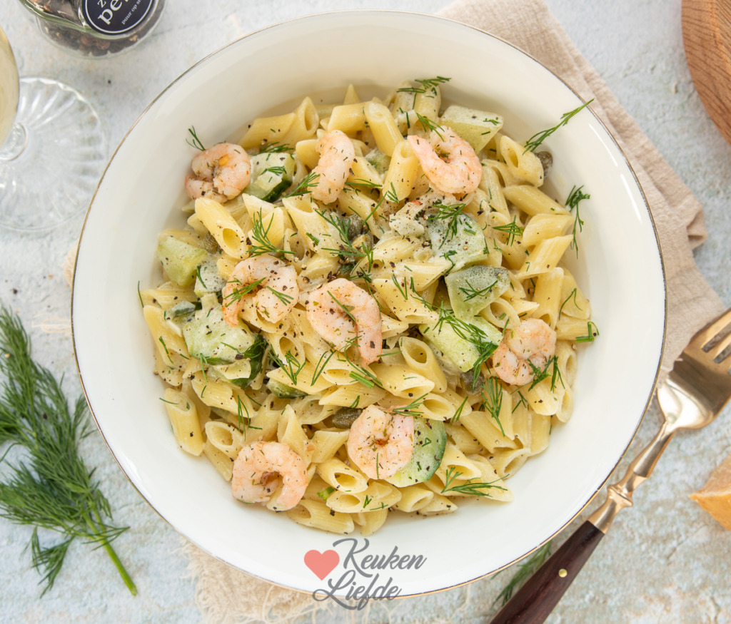 Een heerlijke pasta met komkommer, dille-roomsaus en garnalen. Makkelijk om te maken en binnen 20 minuten op tafel.