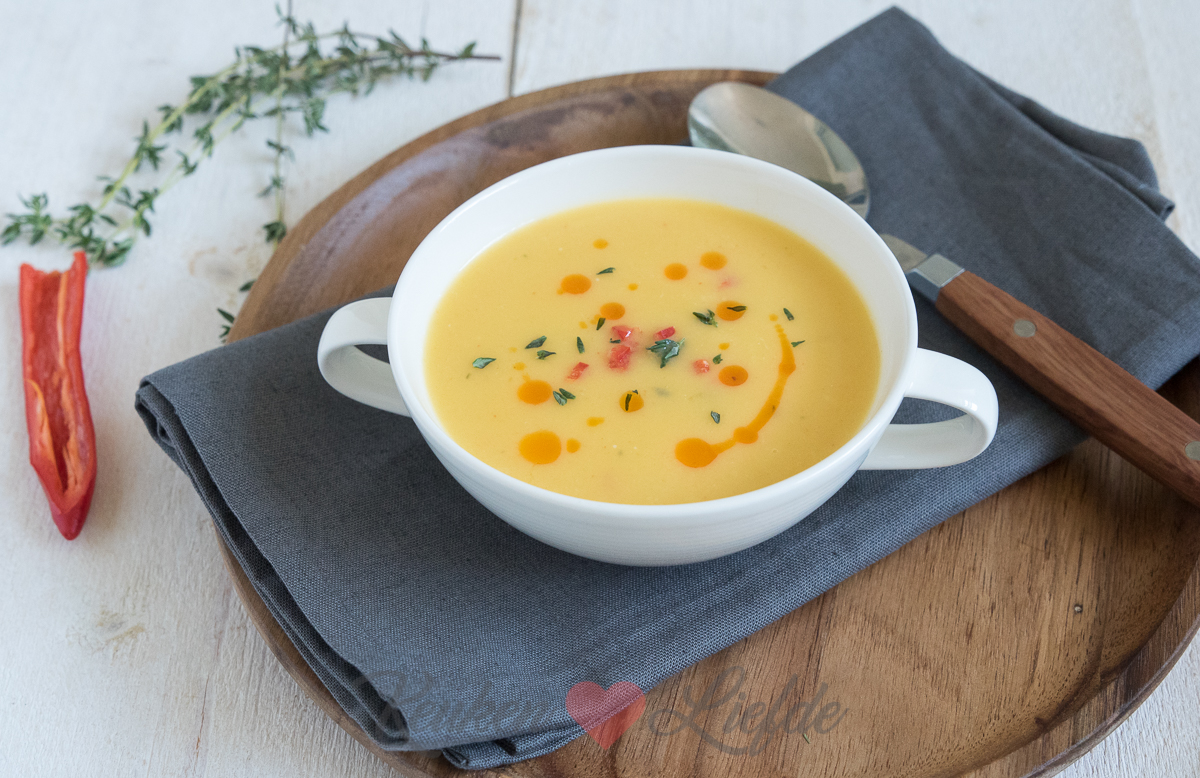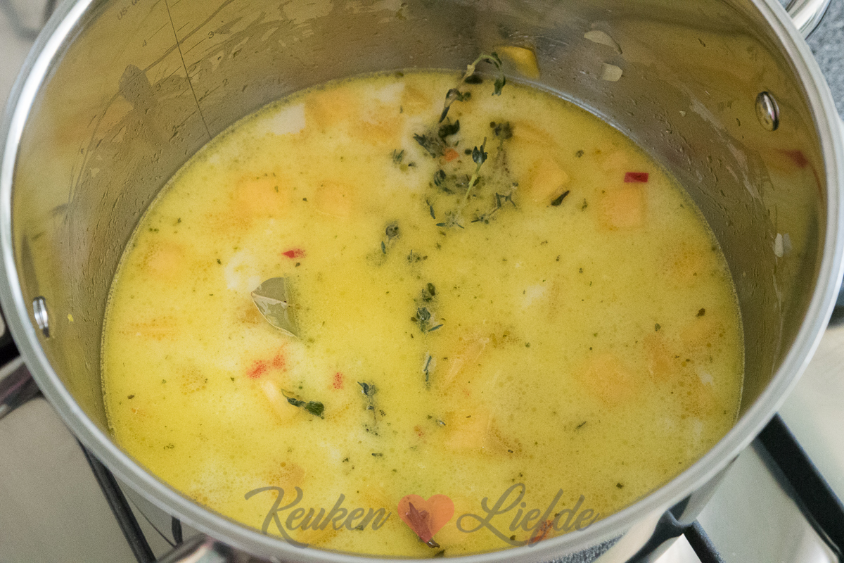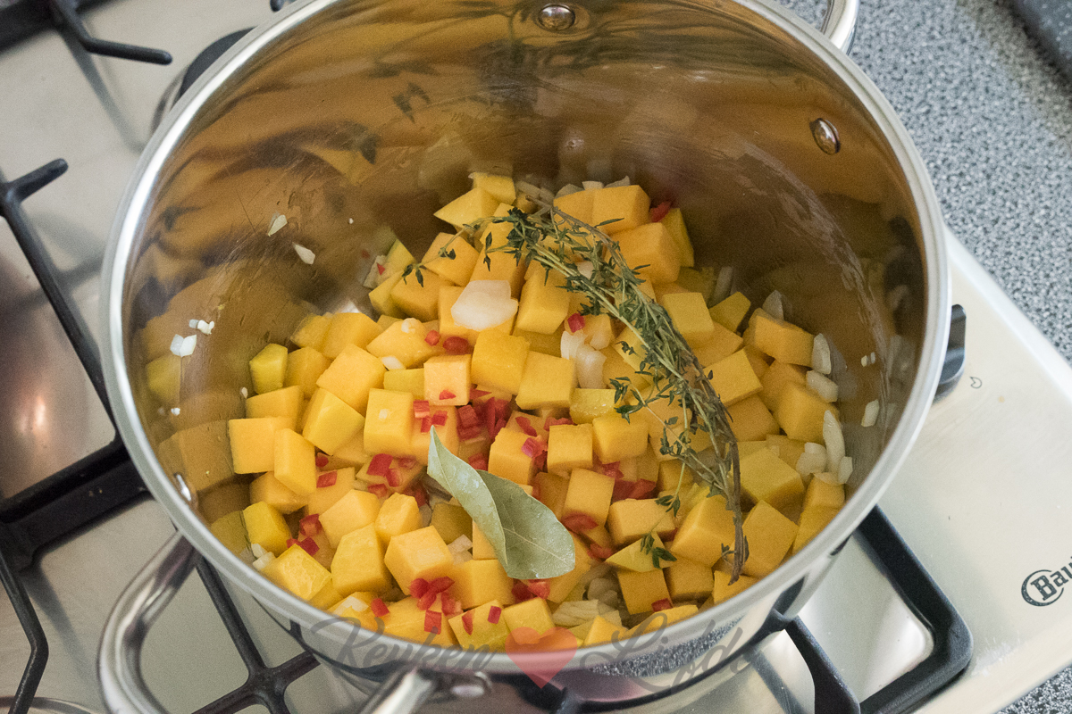 Verhit een soeppan met een scheut olijfolie en voeg de pompoen, ui, knoflook, laurier, tijm en chilipeper toe (houd wat tijmblaadjes en chilipeper achter voor garnering). Fruit circa 6 minuten op zacht vuur tot de pompoen wat zachter begint te worden.