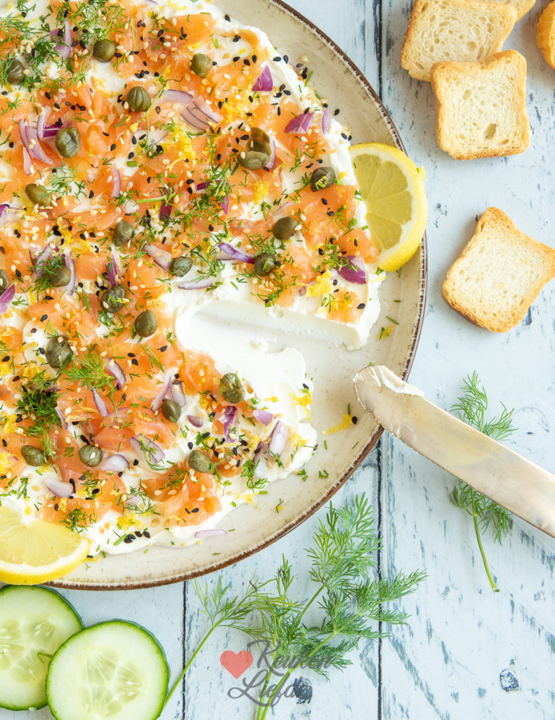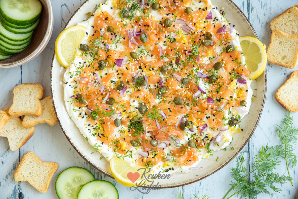 De basis van dit borrelbord is de roomkaas, dus kies een neutrale, verse roomkaas die makkelijk smeerbaar is. De topping van zalm, frisse citroenrasp en kappertjes, dille en sesamzaadjes maken er een feestelijke roomkaasdip van.