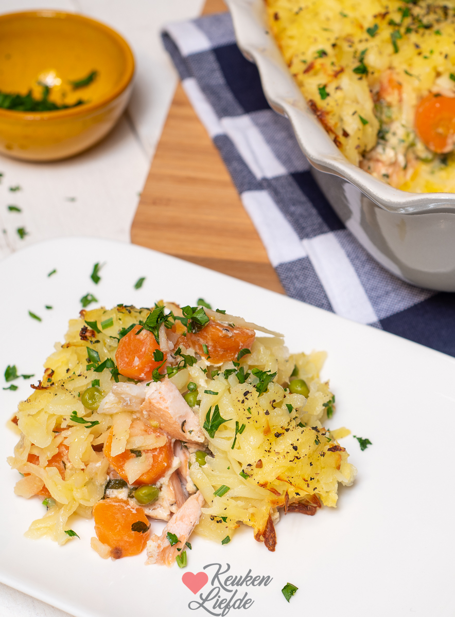 Sappige visfilet met romige wortel en doperwtjes en een knapperig röstidakje: deze rösti-ovenschotel met vis en wortel is verrukkelijk!