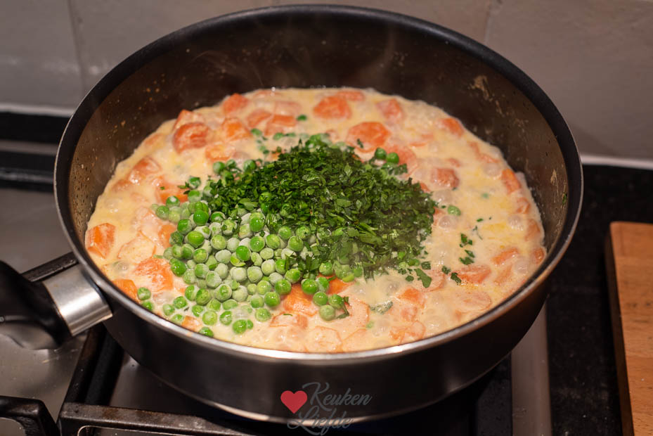 Je kunt deze ovenschotel van tevoren al maken (laat de saus met de wortel en doperwten dan eerst afkoelen voordat je ze over de vis verdeelt, want anders gaart de vis al) en tot gebruik in de koelkast bewaren. Voordat je aan tafel gaat hoef je hem alleen af te bakken in de oven.
