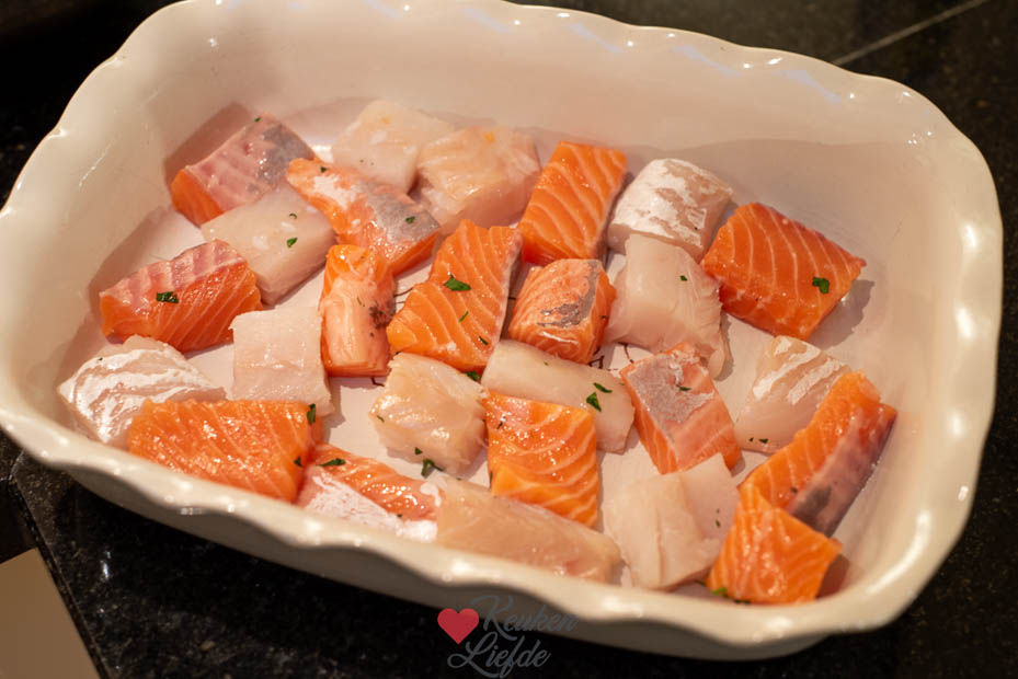 Ik gebruik kabeljauw en zalm in dit recept maar je kunt ook andere vis gebruiken die je lekker vindt of die op dat moment in de aanbieding is. Je kunt ook rauwe, gepelde garnalen toevoegen.
