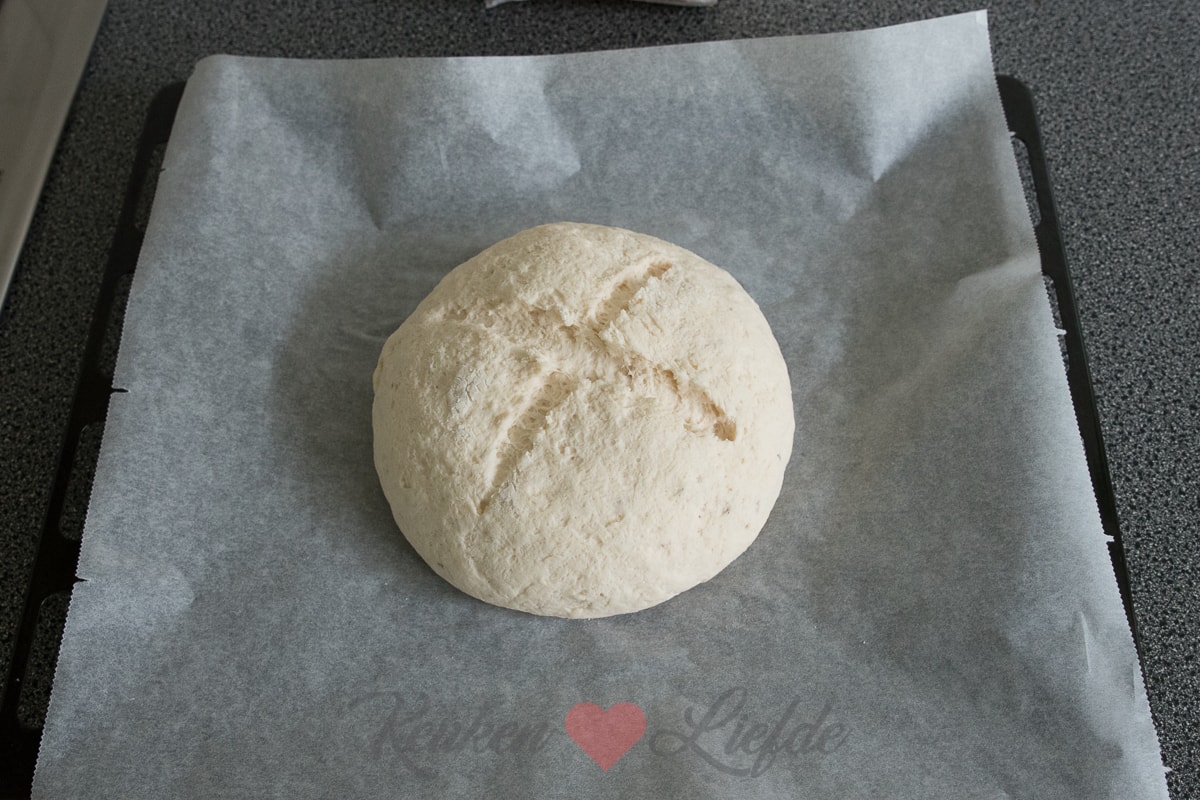 Stort de deegbal op een licht bebloemd werkblad en vorm er met je handen een rond, bol brood van. Bekleed een bakblik met bakpapier. Kerf de bovenkant van het brood met een scherp mes kruisvormig in en leg het brood op het bakblik. Zet een grote pan omgekeerd over het deeg op het bakblik en zet het bakblik nog 15 minuten op een warme plek (bijvoorbeeld naast de verwarming) om na te rijzen.