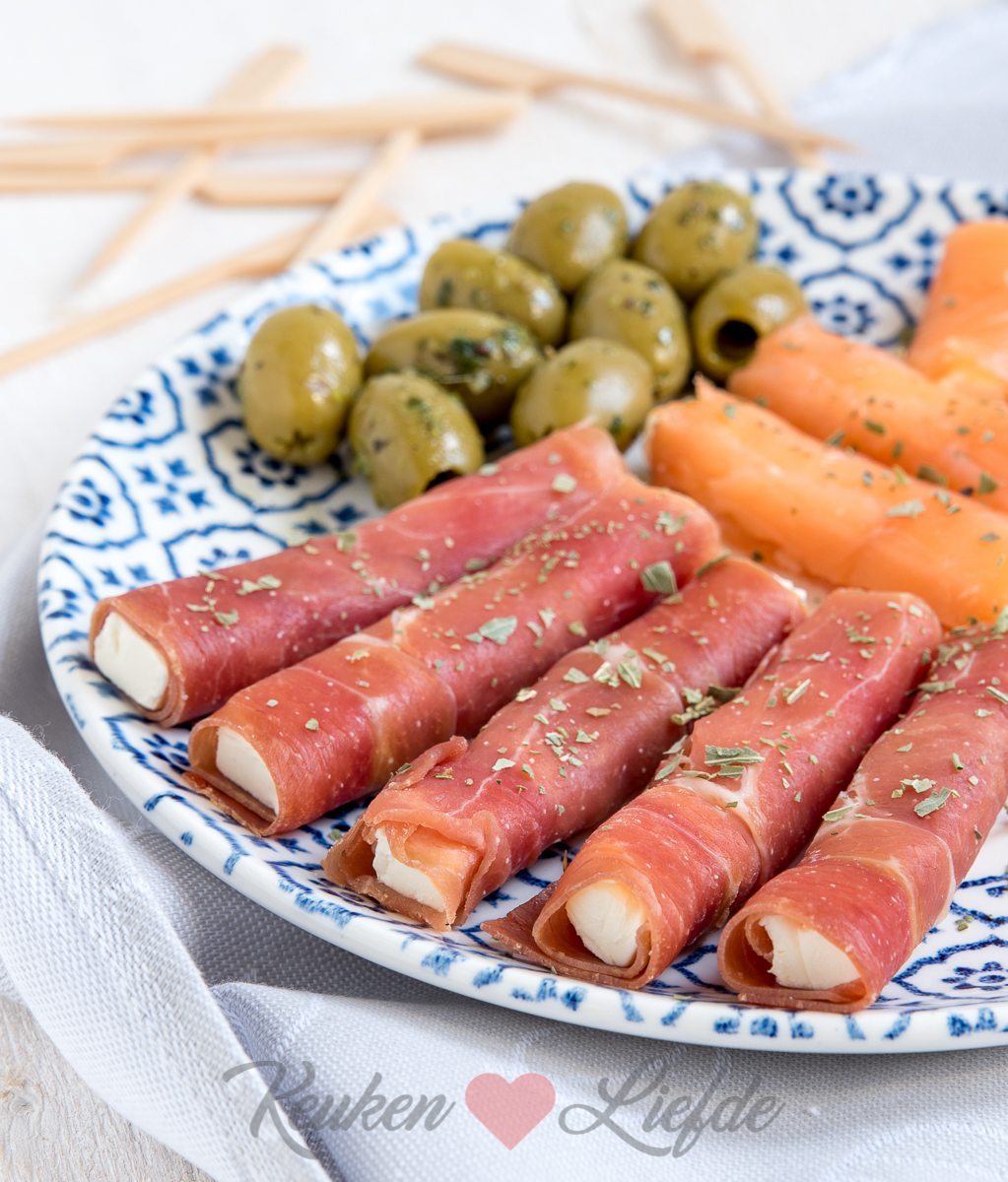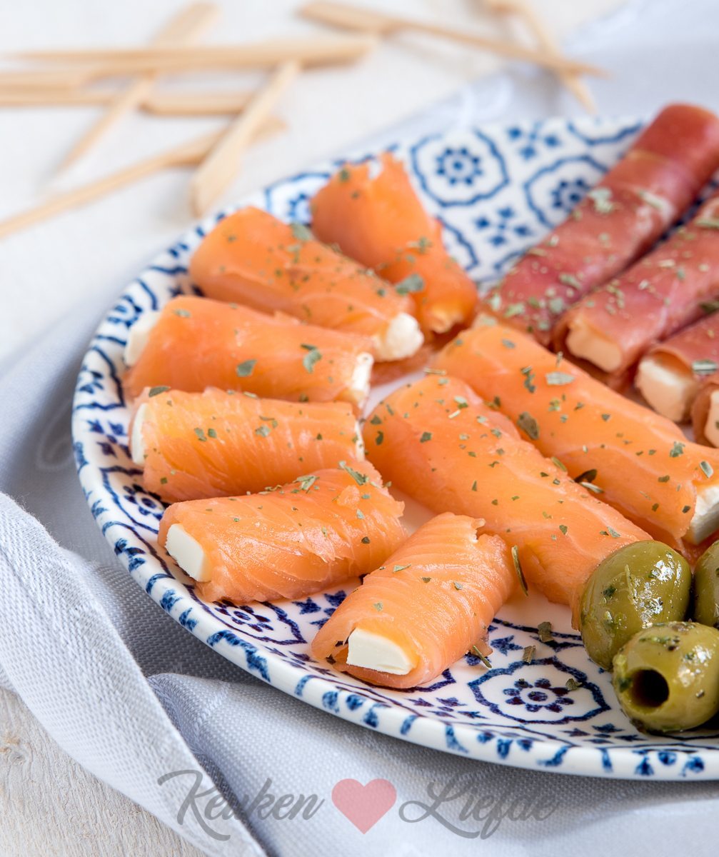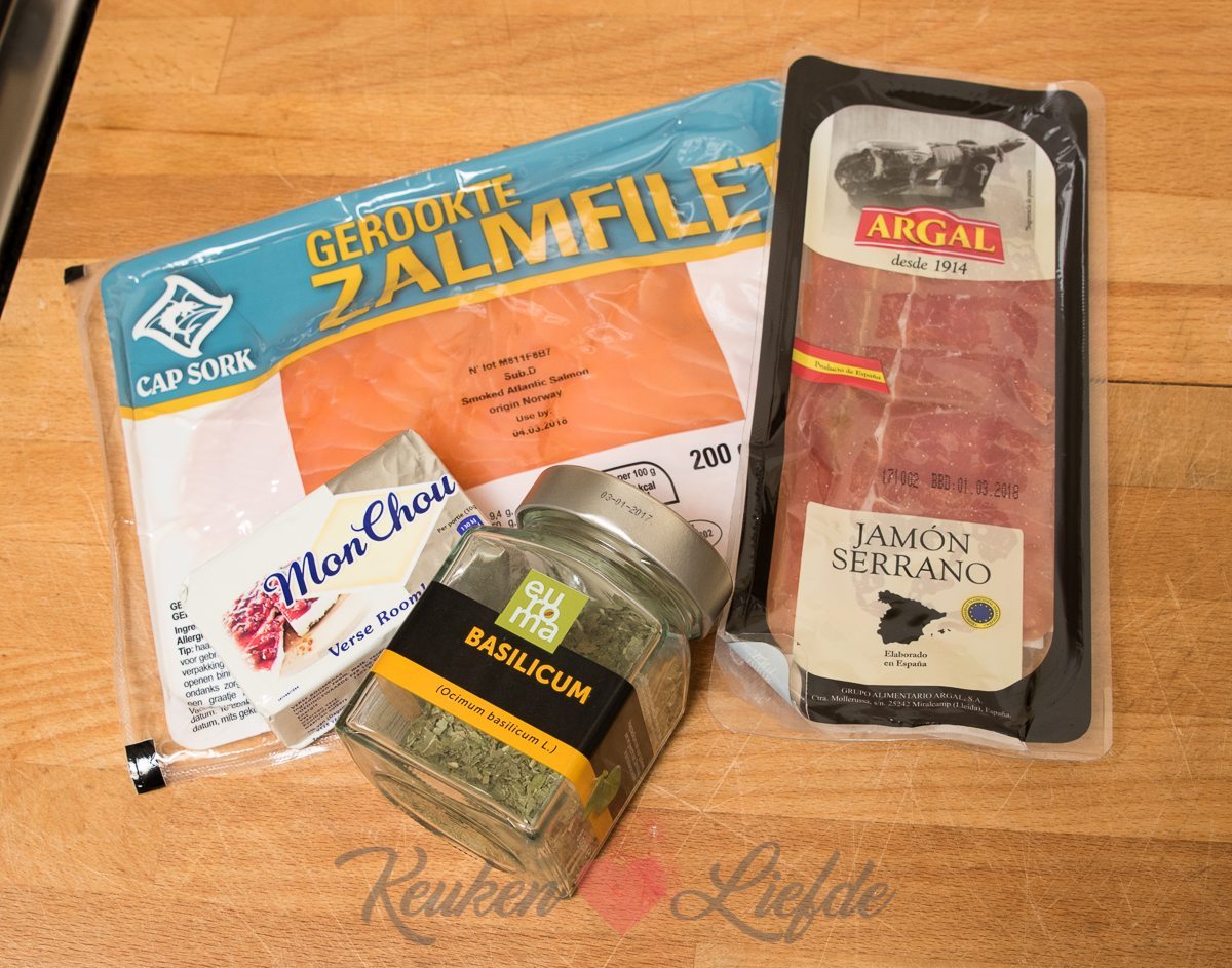 Van lekkere borrel- of verjaardagshapjes kun je nooit genoeg recepten hebben. Althans, dat is mijn bescheiden mening. 🙂 Ik houd ervan! Als dochterlief en ik weer eens verlekkerd langs de tapasafdeling in de supermarkt lopen, vraagt dochterlief steevast: “Mama, zullen we zo’n bakje meenemen?”. Ik ben vaak makkelijk over te halen — zeker als het om lekker eten gaat —, maar borrelhapjes uit een bakje gaat me toch te ver. De ham- en zalmrolletjes die ze aanwijst kun je zo makkelijk zelf maken. Hup, ik gooi snel een pakje serranoham, gerookte zalm en MonChou in het mandje. Feest of geen feest. Die borrelhapjes maken we zelf!