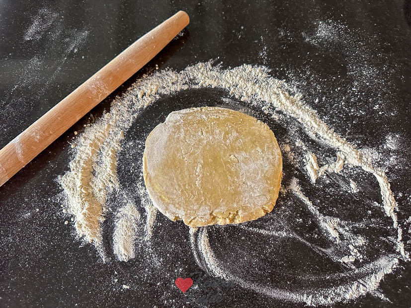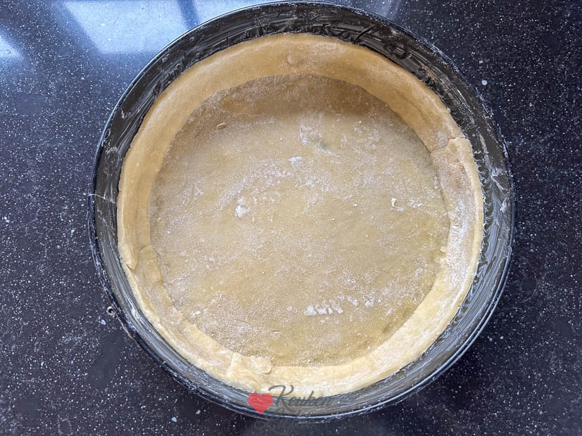 Voor dit recept gebruik ik mijn zelfgemaakte korstdeeg. Je kunt natuurlijk ook kant-en-klaar hartig taartdeeg gebruiken, maar zelfgemaakt korstdeeg is heel eenvoudig en ik vind het veel lekkerder dan kant-en-klaar deeg. Het is lekker bros en vol van smaak. Je hoeft voor dit recept maar de helft van het korstdeeg te gebruiken. De andere helft kun je invriezen voor een andere keer.