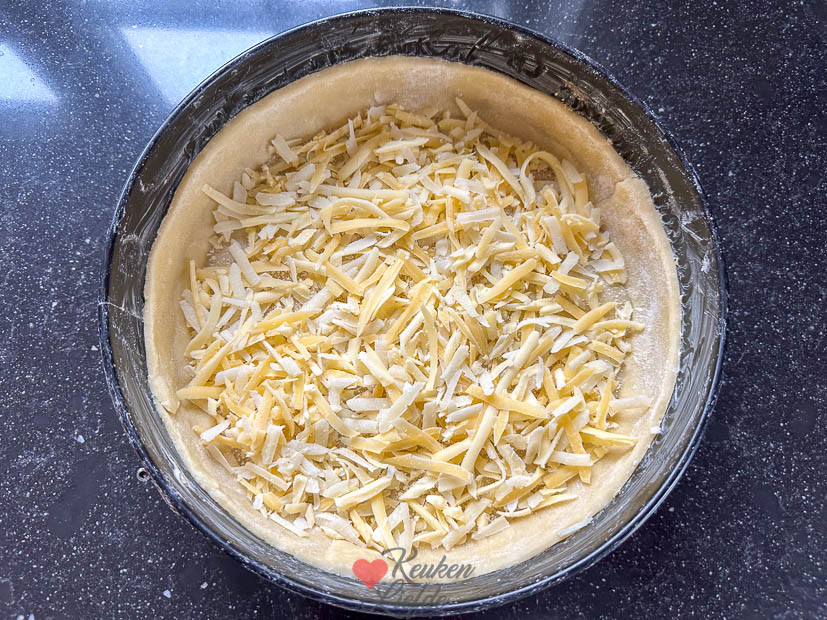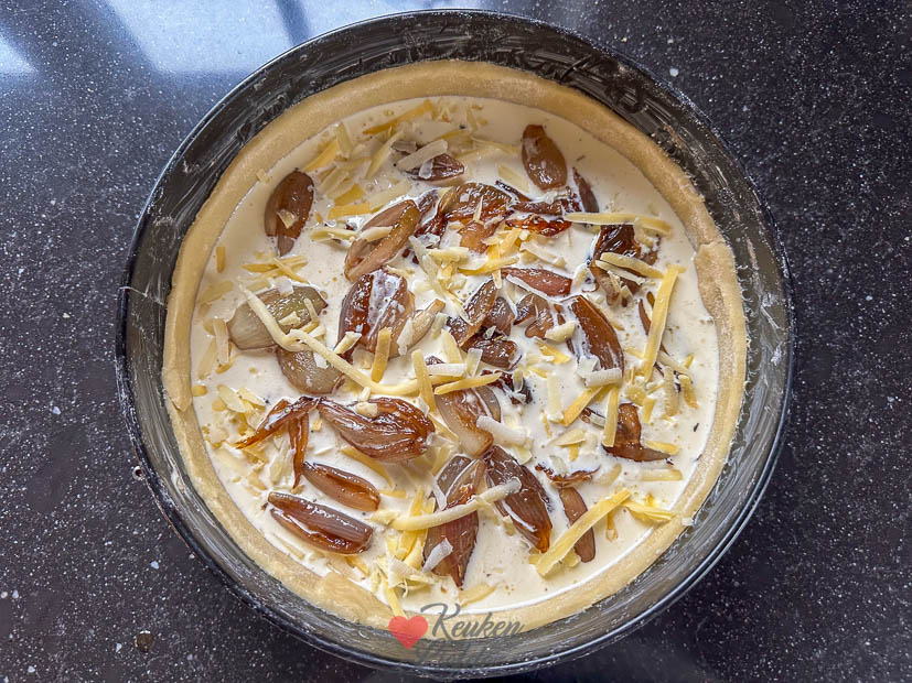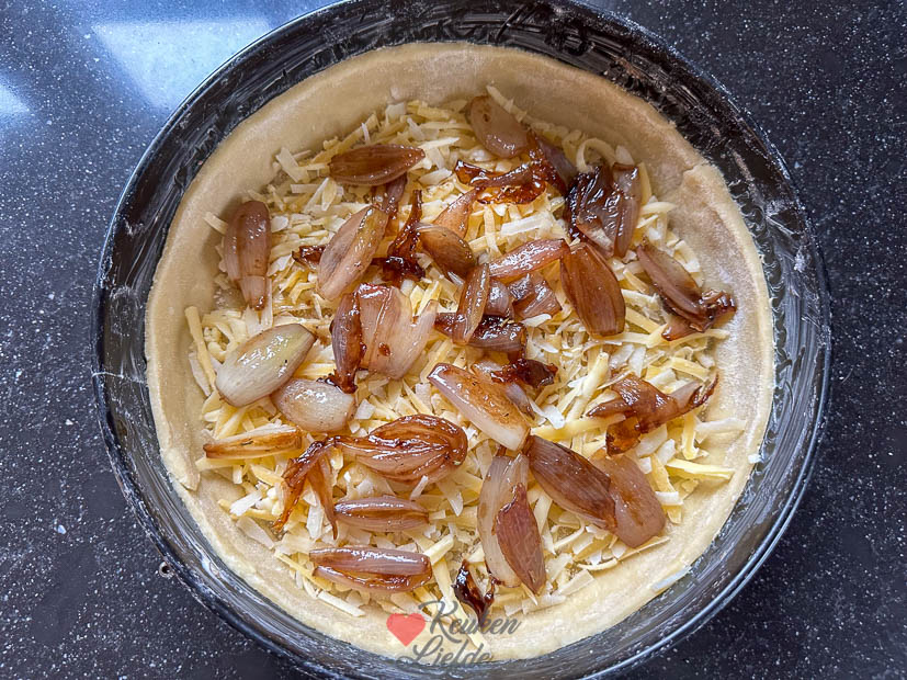 Het grootste deel van de kaas strooi ik over de quichebodem en daarop leg ik de sjalotten. Zo blijf je na het bakken de sjalottenvulling goed zien.