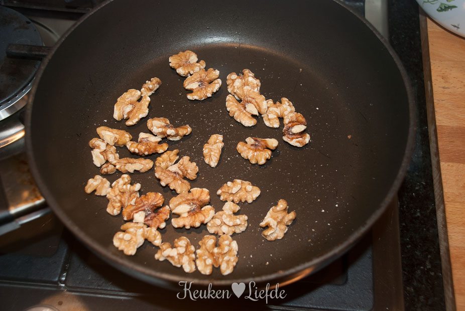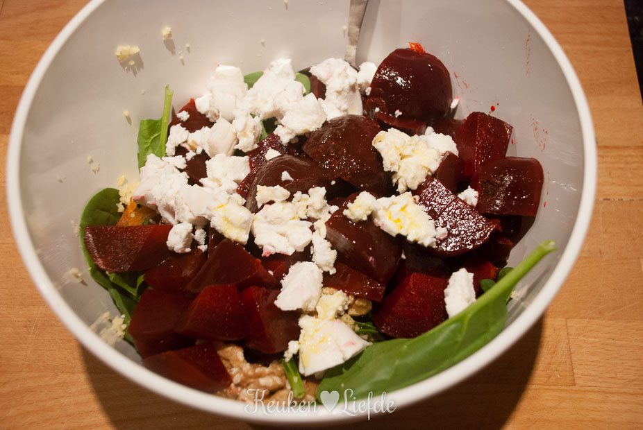 Oke, want ik zat te twijfelen of ik het al vooraf zou maken ivm weinig tijd, maar het is ook zo klaar eigenlijk. De bietjes had ik al gesneden en komen uit de diepvries en ik neem pijnboompitjes ipv walnoot want anders lusten de kinderen het niet. Dan is het ook zo klaar. Ik ga toch voor de lauwe variant en dan wordt het aan tafel wel verder koud. Hebben we alle 2 geproefd. 😉