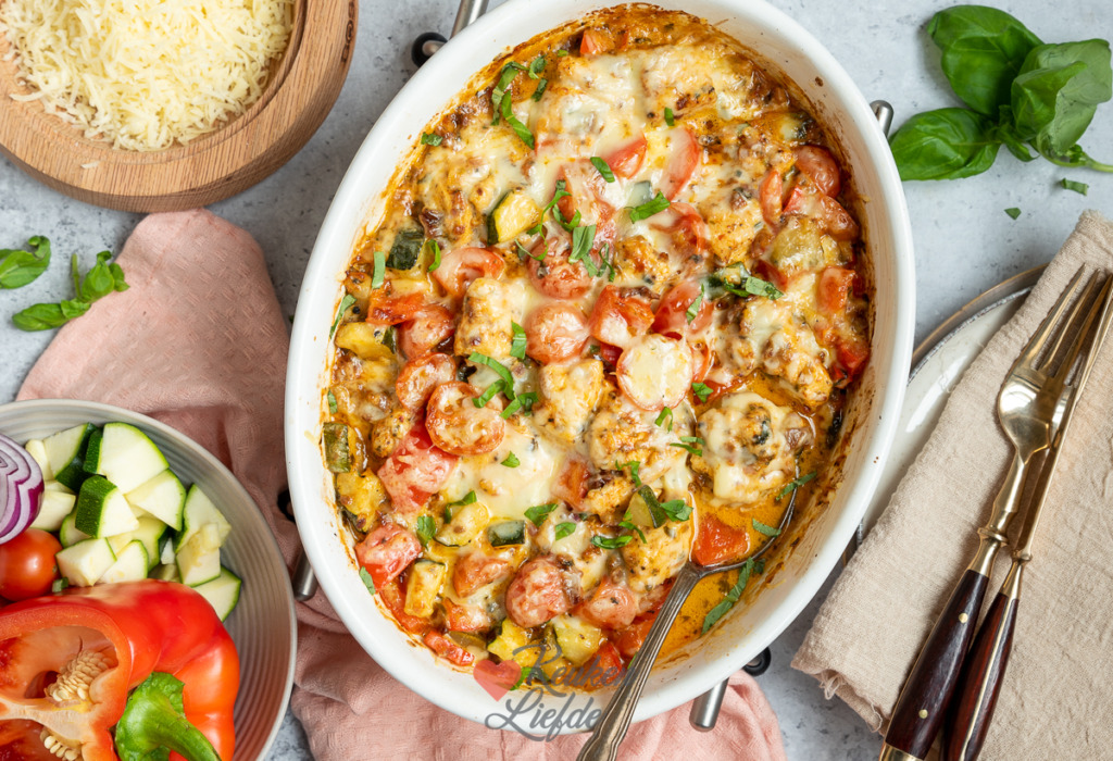 Een slanke Italiaanse kipschotel met courgette, paprika, tomaat en kip gegratineerd met 30+ kaas. Voor dit makkelijke recept hoef je alleen wat snijwerk te verrichten, daarna gaat alles ongekookt in de ovenschaal. De oven transformeert de groenten in een smakelijke saus en bakt de kip lekker mals. De 30+ kaas bovenop maakt het lekker romig.
