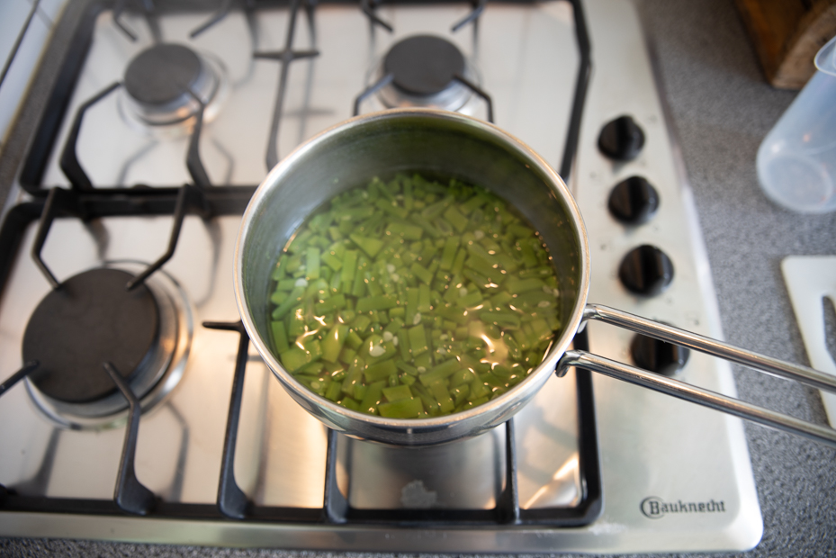 Kook de snijbonen in een pan met ruim kokend, licht gezouten water beetgaar. Giet de snijbonen af en vang 275 ml kookvocht op. Laat de snijbonen goed uitlekken in een zeef of vergiet.