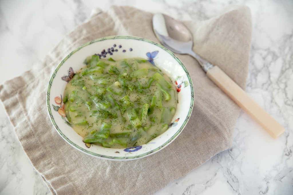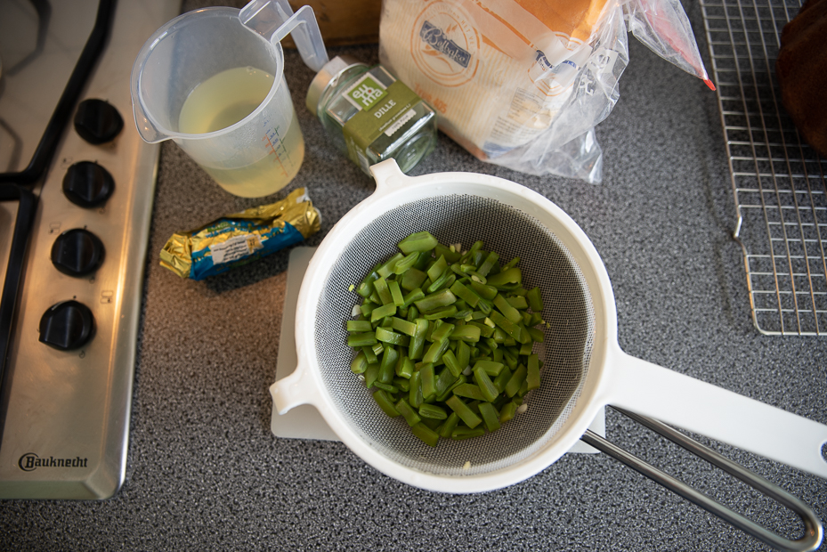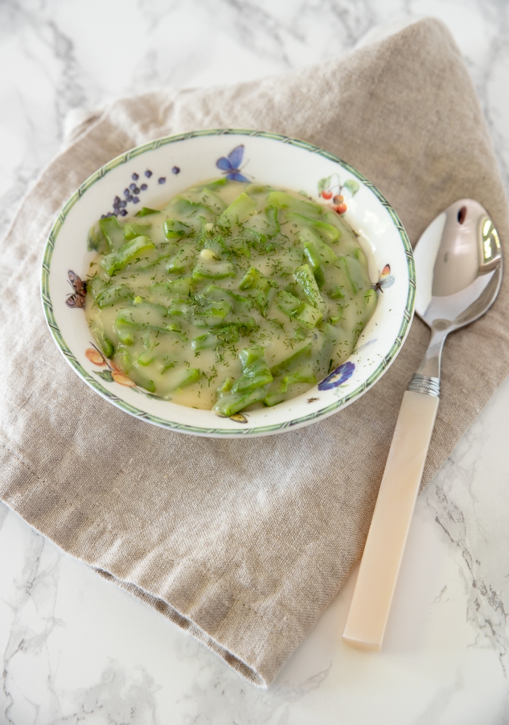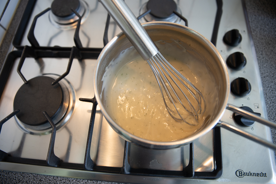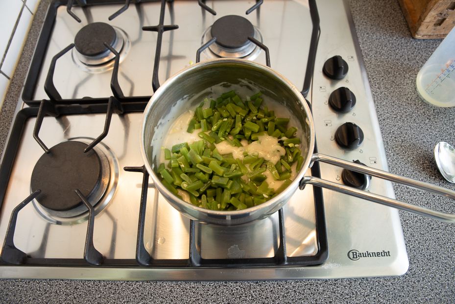 Voeg langzaam en al roerend het opgevangen kookvocht toe tot je een dikke, romige saus hebt. Roer de dille en snijbonen door de saus en breng indien nodig extra op smaak met zout en peper. Warm de saus nog even door tot de snijbonen goed warm zijn.