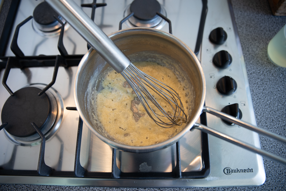 Smelt de boter in een pannetje op laag vuur. Voeg de bloem toe en roer met een garde door de boter. Dit bloemmengsel heet roux. Laat de roux op laag vuur circa 6 minuten garen, zonder te laten kleuren. Roer regelmatig met de garde.