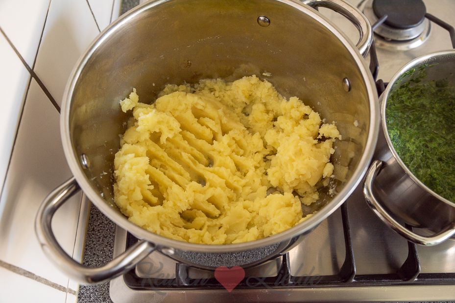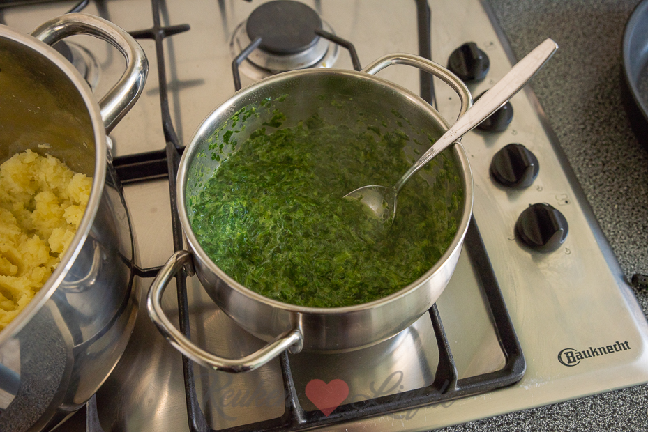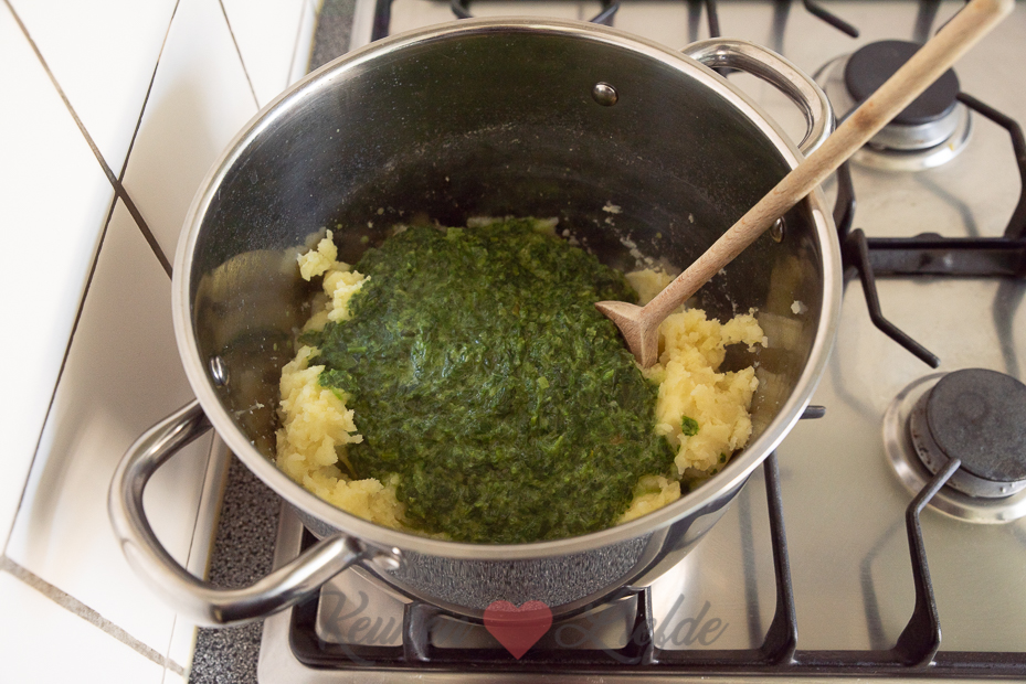 Giet de aardappels af en stamp ze fijn. Roer de spinazie à la crème en Parmezaan (houd wat achter voor garnering) door de aardappelpuree. Proef en breng indien nodig extra op smaak met zout en peper uit de molen. Als je van pit houd net zoals ik kun je ook een snuf gedroogde chilivlokken toevoegen. (Zie ook onderstaande tip!)