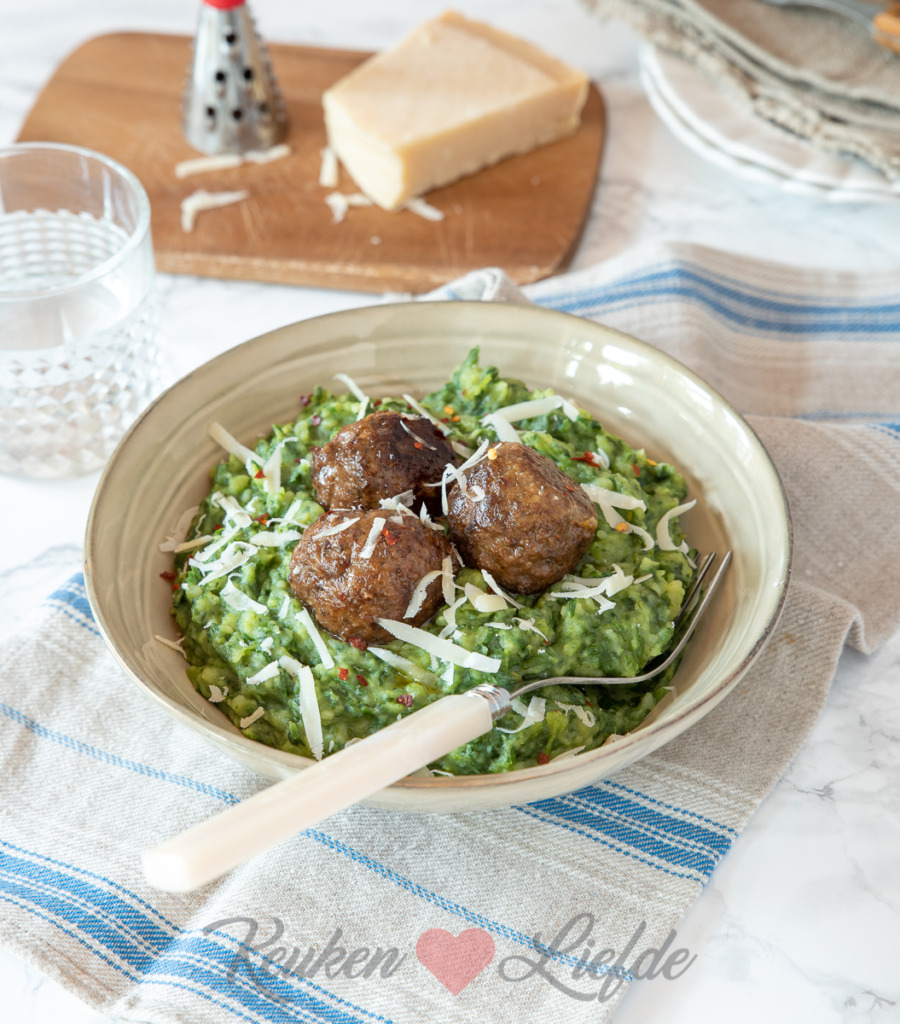 Serveer de spinazie stamppot met de pesto gehaktballetjes en bestrooi met de achtergehouden Parmezaan.